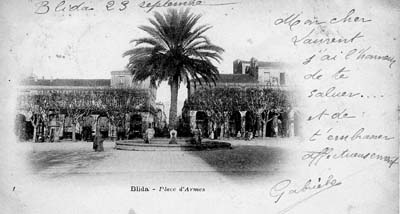 Avant de quitter Médéa pour Laghouat, je me rendis à Blidah. C'est une petite ville très moderne au milieu de la vigne et des palmiers Elle est admirablement située, on y trouve tous les fruits du midi de la France. C'était un centre arabe célèbre. Elle est sans industrie et le chemin de fer a tiré son commerce, c'est maintenant une seconde St Omer. On n'y voit que de la troupe. Mille amitiés