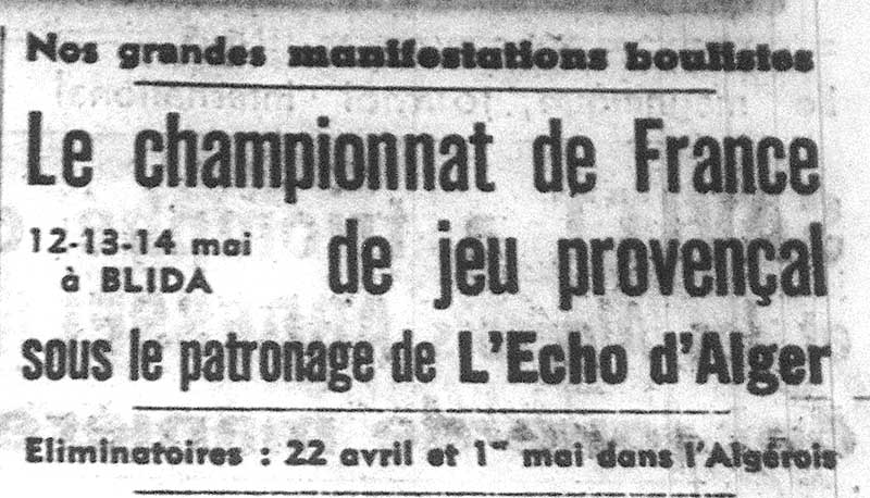 Championnat de France de boule provençal à Blida en 1951 C'est avec juste raison que la Fédération bouliste nord-africaine a choisi la ville de Blida pour y faire dérouler, dans le magnifique jardin du "Bois sacré", le championnat de France. Dès la première heure les délégations métropolitaines et nord-africaines furent réunies en présence de Mr Gueran, maire de la ville, au monument aux morts où fut déposée une gerbe. Le Nedjma clique prêtait son concours à cette manifestation qui avait attiré un public dense. A 8h30 les participants firent leur entrée sur le terrain du concours où ils reçurent un souvenir de la part de Mr Bovet, président des Boulomanes B R. L'organisation peut être classée comme une des meilleures, et la satisfaction exprimée par les différentes délégations, ainsi que par les spectateurs, fait honneur aux dévoués dirigents de la Fédération. Du côté du jeu, les parties furent agréables à suivre, étant donné la valeur des compétiteurs et aussi l'attrait unique de cette manifestation, le titre national. Une foule intéressée^par les exploits des joueurs français ne manqua pas de les applaudir dans leurs actions suivies et supérieures. La présence des journalistes, Girbon et Vesien du "Provençal" , Chaillot du "Midi Libre", Ferrara de "Sprinter", Command Manier de la "République de Toulon" montre l'importance de cette manifestation La finale de ce championnat a eu lieu sur le stade de basket du F.C.B parfaitement paré pour la circonstance. Elle se déroula sous la présidence de M.Guerrand, maire de Blida: Les gars de Nîmes pour la troisième fois emportent le titre dans des conditions parfaites. C'est vraiment une belle équipe, extrêmement sympathique et dont la tenue a laissé une impression favorable aux spectateurs du tournoi. Cela n'a pas été une très grande partie, le terrain excessivement dur ne se prêtait pas au tir et au pointage. Par ailleurs, la température très fraîche a nui à l'action des joueurs.