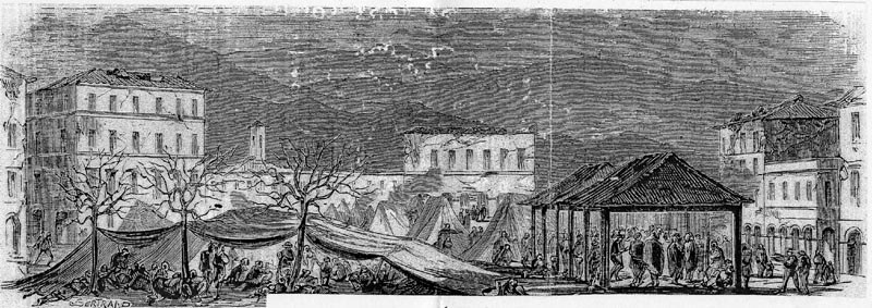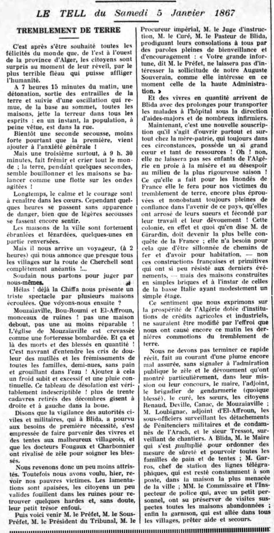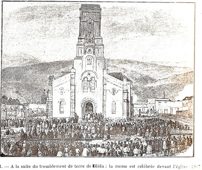 Bien avant cette année, notre ville avait subi déjà de nombreuses calamités sous la forme de tremblements de terre, d'épidémies (choléra) et d'invasions de sauterelles. L'année 1867 n'est peut être pas la pire mais c'est celle qui bénéficie d'une "meilleure couverture médiatique", les témoins sont plus nombreux et les évènements sont écrits. Vous trouverez ci-dessous 2 témoignages distincts: le premier est le colonel TRUMELET pour qui l'histoire de Blidah n'a quasiment pas de secrets et le second est l'éditorialiste du TELL: Mr CHALEIL. La Place d'Armes transformée en camp de toile après le séisme de 1867 Le texte du Colonel TRUMELET est extrait de son livre BLIDA - Récits selon la légende, la tradition et l'histoire Tome II publié en 1887. L'article de Mr A.Chaleil est paru dans le TELL en fin de l'année 1867 Jacques Roseau dans le 13 ième Convoi en parle aussi: merci à Marie Elisabeth de m'avoir envoyé ce texte. On peut lire la description du tremblement de terre de 1825 du colonel TRUMELET et aussi le compte rendu paru dans le Courrier de l'Algérie Voir aussi l'article sur le sujet dans l'Echo d'Alger de janvier 1867