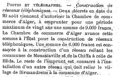 Les Télécommunications : Transméditérranéennes : 6 câbles sous marins 4 voies radio électriques 1 faisceau hertzien Sahariennes :2 câbles souterrains 1 faisceau hertzien en 1961 Téléphone : 1953 : 15 Centraux 117.000 postes téléphoniques EN 1960 une très belle MAISON DE LA RADIO DIFFUSION ET DE LA TELEVISION fut construite au Bd BRU à ALGER.. |