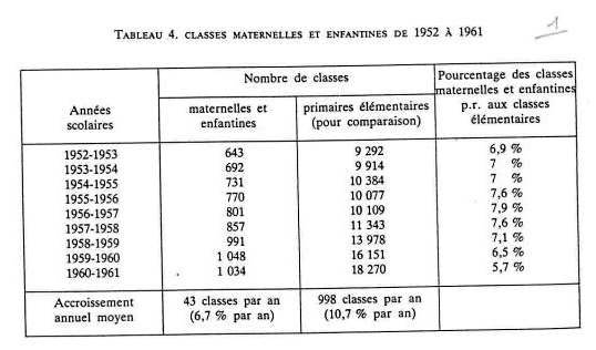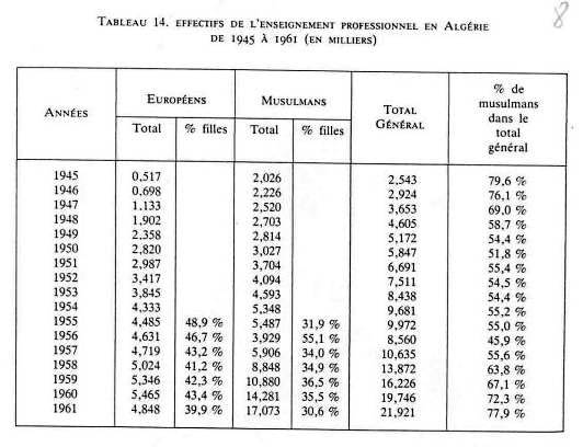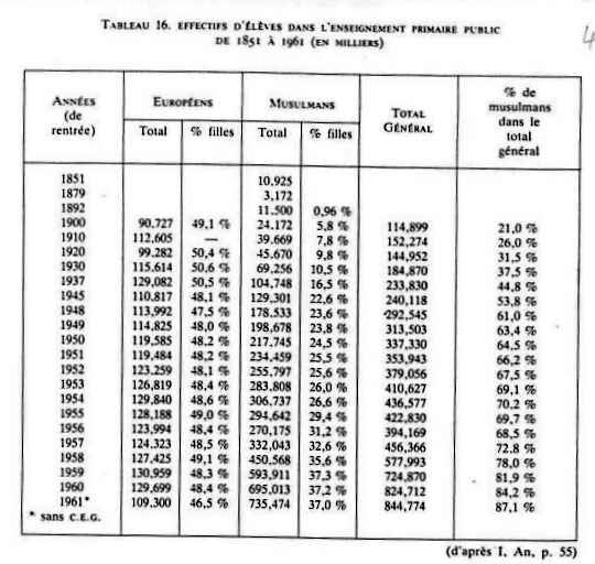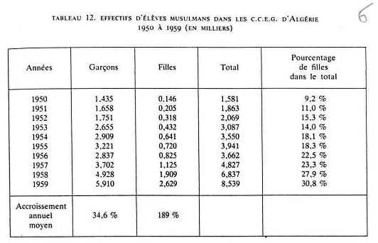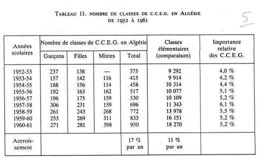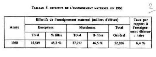 200 israélites, 95 arabes. 1845 : 1 ère école de filles musulmanes, créée à Alger à titre privé : 150 filles. A partir de 1923 : afflux des musulmans vers l'école française ENSEIGNEMENT PRIMAIRE : - tableau classes maternelles et enfantines de 1952 à 1961 - effectifs de l'enseignement maternel en 1960 - tableau enseignement primaire en Algérie de 1830 à 1962 - tableau effectifs d'élèves dans l'enseignement primaire public de 1851 à 1961 ENSEIGNEMENT PRIMAIRE COMPLEMENTAIRE - 1 Cours complémentaires d'Enseignement Général : tableau nombre de classes de C.C.E.G de 1952 à 1961 tableau effectifs d'élèves musulmans dans les C.C.E.G. d'Algérie de 1950 à