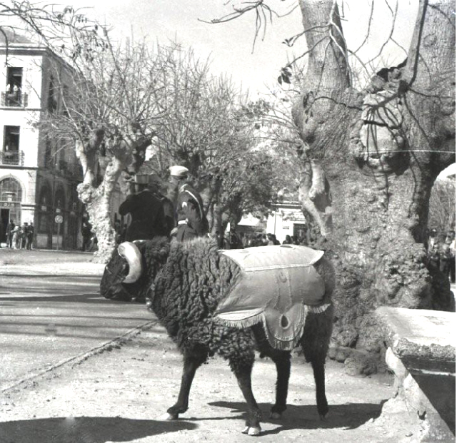 La mascotte, un bélier, défile en tête.