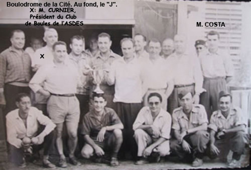 Photos transmises par Jean-Claude COSTA, du "J": 1: Dans le café des Arcades, 2 à 6: La Garde Territoriale (Dont M. COSTA père et M. MERCIER de la chaufferie), 7: Communion de Mlle GOEP, place des Palmiers, 8: Réveillon 1960 chez les CRUZ, 9: Boulodrome de la Cité (1 nom ajouté le 08.02.2011 par J. STABILE).