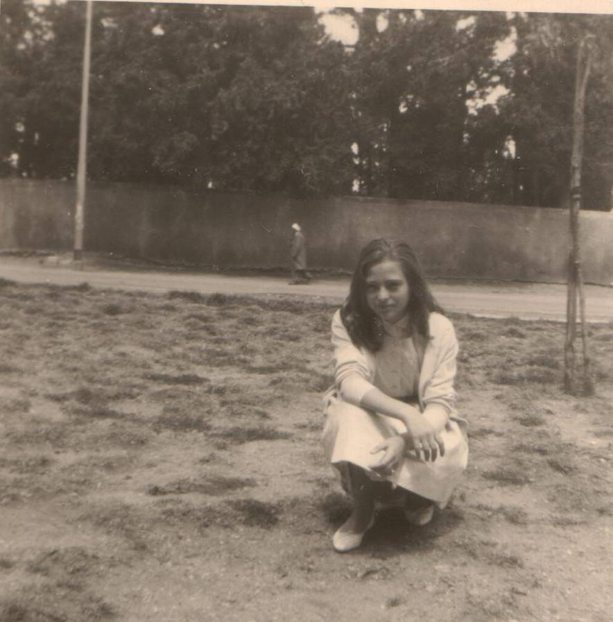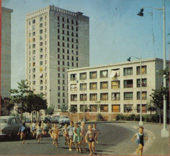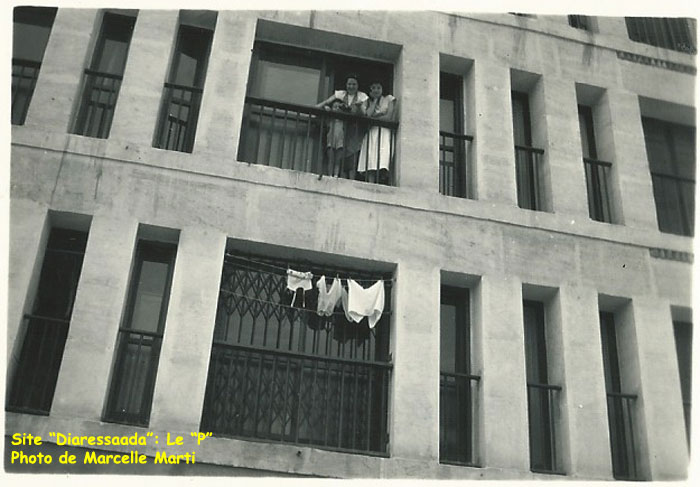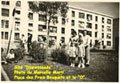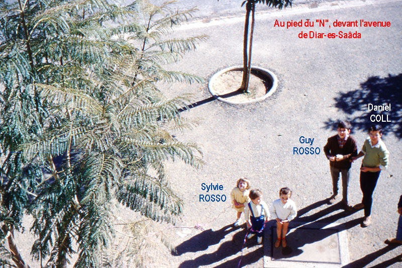 Photo commentée par Maguy REINERT (mise aussi dans "autres documents et photos"): seul devant, Lucien REINERT, puis Michel MAURER, Maguy REINERT (robe verte), Jean-Louis MAURER (blond), Jean BRUZZI, Marie-Thérèse REINERT et Anne-Marie BRUZZI (robe jaune), traversant l'avenue de Diar-es-Saâda. En arrière plan, le bâtiment "G" et la Tour.