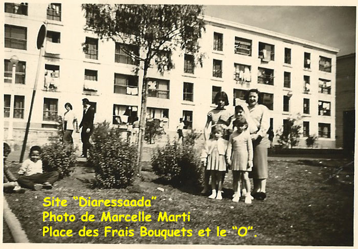 Une belle série de photos de Guy ROSSO, avec aussi les ABENTIN ou COLL. Cela commence en noir et blanc par 7 photos prises place des Palmiers, 1 place des Frais-Bouquets, 2 chez lui bâtiment "N", 1 personnelle en communiant, 1 de M. ABENTIN. Les photos suivantes, en couleur, ont été tirées à partir de diapositives: 8 dans le "N" ou depuis le "N", dont un coin de la place des Frais-Bouquets et ses lantanas. Puis 7 vues des jeux et de la piscine de la Croix-Rouge, centre de jeunesse Frédéric-Lung, 4 au tout début des années soixante, et 3 en 1977. Enfin 1 vue d'Alger d'époque, et 4 photos de Saâda prises en 1977.