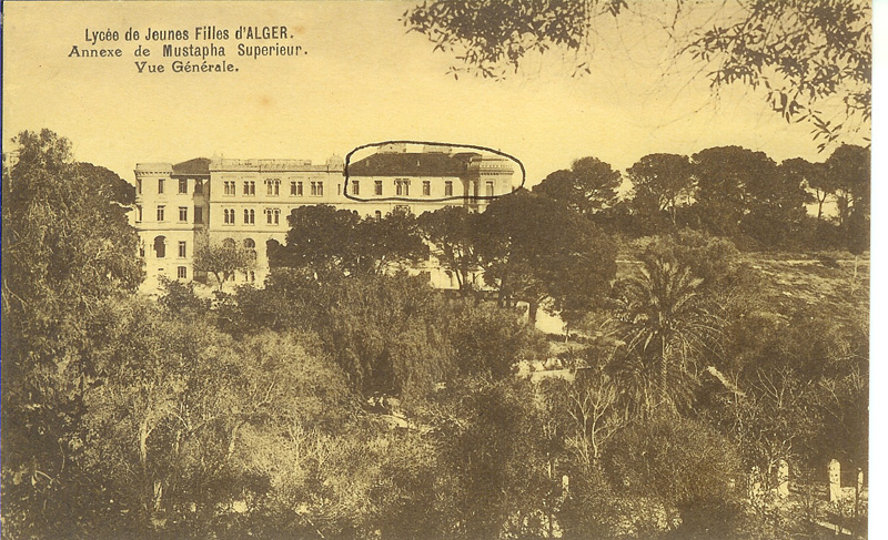 - "Lycée de Jeunes Filles d'ALGER, Annexe de Mustapha Supérieur, Vue Générale". Le Lycée remplaça le "Mustapha Palace Hôtel".
