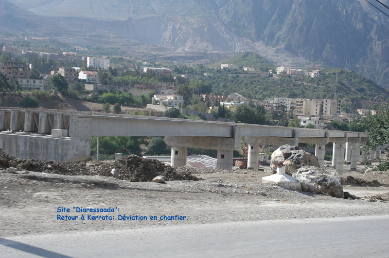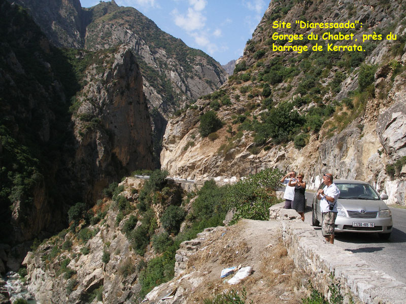 Le défilé de la mort). Ce tunnel long de 9 kilomètres entre Taskriout et Kerrata, construit sans doute dans les années 80, ne possède ni éclairage, ni ventilation, ni aires de dégagement; fort heureusement nous trouvâmes une échappatoire à mi-distance, nous permettant de retrouver l'ancienne route des Gorges, ouf! Les Gorges du Chabet-El-Akra sont les plus profondes et les plus sauvages de l'Algérie, creusées dans les calcaires de la petite Kabylie, entre Djebel Adrar ou Mellal (La montagne Blanche, 1.773 m.) à l'Est et les contreforts du Takoucht (1.896 m.) à l'Ouest. Nous rejoignîmes alors le