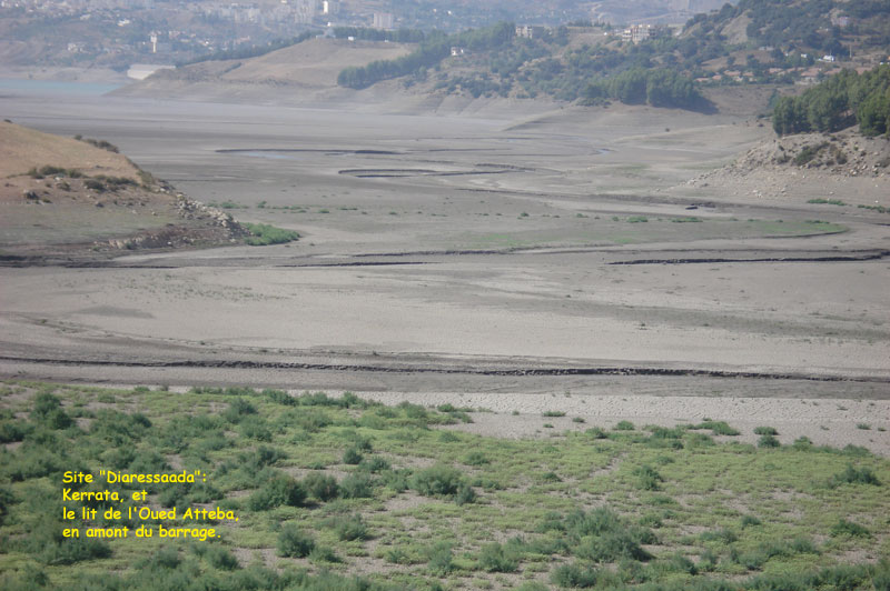 barrage de l'Iril-Emda (ou Ighil-Emda), étant certains de ne pas apercevoir de barrages militaires ou policiers pour prendre des photos. Le barrage-poids par accumulation de graviers sur une largeur de 250 m., une longueur de 575 m. et une hauteur de 75 m., permet de retenir 160.000.000 m3 d'eau dans un paysage de petites montagnes arides. Notre parcours est décrit sur la carte ci-contre. L'oued Agrioun est de fait constitué par les oueds Embarek, El-Berd et Atteba, retenus par le barrage. Nous redescendîmes ensuite à