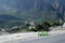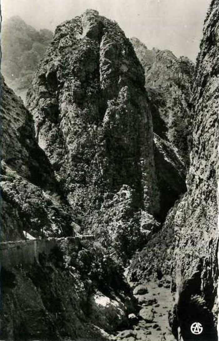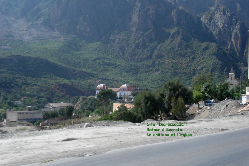 Kerrata (13.758 habitants en 1960, dont 324 européens (mais 631 en 1954)). Le village de Kerrata fut créé en 1870 par 13 familles de 42 personnes et il fut officialisé en 1876. Le Château d'Eugène Dussaix date de 1913, et l'Eglise de 1921. J'ai, comme souvent, scanné d'anciennes cartes postales pour mettre en valeur les photos d'aujourd'hui. Nous reprîmes les Gorges du Chabet-El-Akra, au départ par la même route, puis en évitant le tunnel pour emprunter la rive droite de l'oued. C'est alors que nous apparut l'inscription de 1945 de la