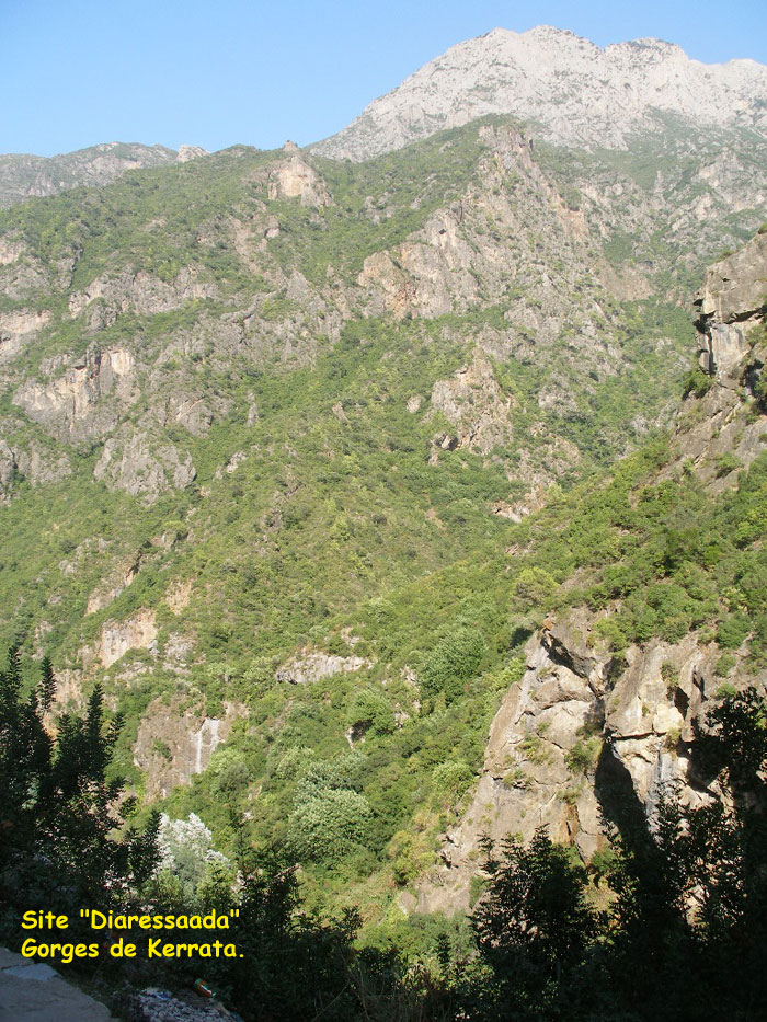Lors de mon retour à Alger en 2005, devant aller à Bougie et en Kabylie, mes amis de la Grande Motte me parlèrent d'une inscription de la Légion dans les gorges de Kerrata. Cette année là je n'allai pas plus loin que Bougie. En septembre dernier, devant de nouveau visiter Bougie en étant hébergé à Tichy, et devant aussi aller à Djidjelli, j'ai demandé à Rabih si je pouvais mettre au programme la visite des gorges, celles ci étant assez proches de Tichy. Outre l'intérêt touristique, sans doute qu'inconsciemment je pensai à la remarque de mes amis, formulée 7 ans plus tôt. La route de Tichy à Souk-El-Tnine par le Cap Aokas est décrite dans la page "Bougie-Djidjelli". Cette page ci sera consacrée aux gorges du Chabet-El-Akra, à Kerrata et aux barrages de Kerrata et de l'Iril-Emda. En fin de page nous ferons un détour par la cascade de Kéfrida.
