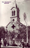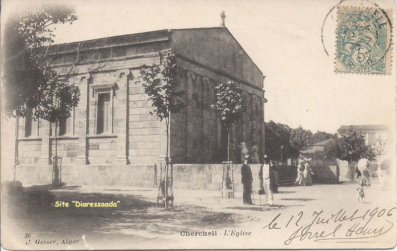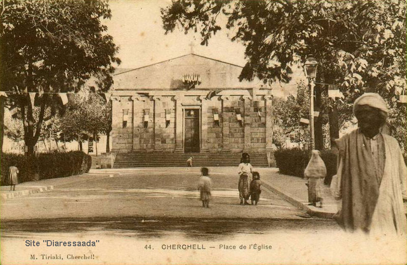 Orléansville: Église Saint-Pierre-Saint-Paul, détruite en 1954 par un tremblement de terre, reconstruite en 1960 et détruite à nouveau par un séisme en 1982. Mosaïques ramenées à Alger (Musée). A droite, l'église provisoire.