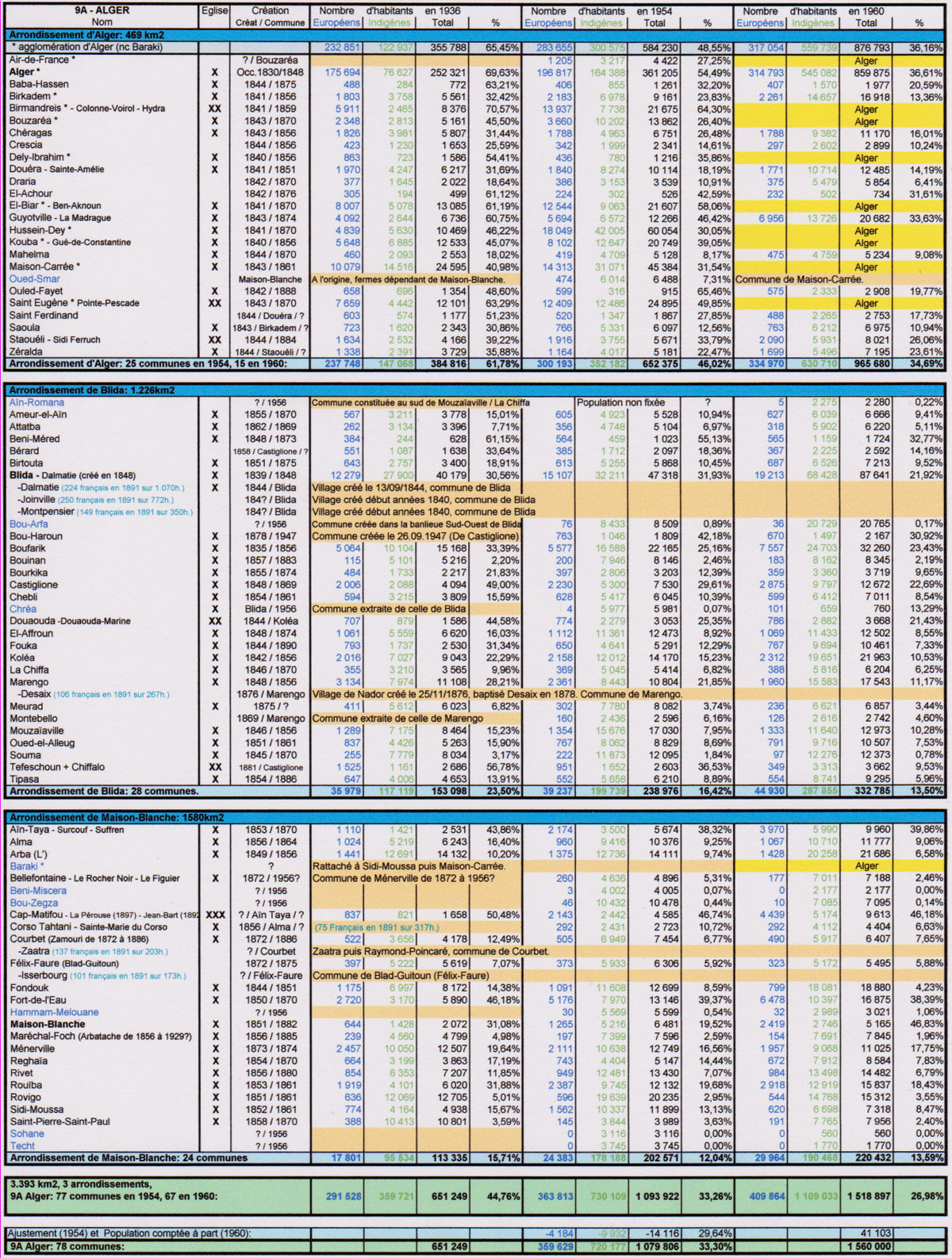 - Colonnes suivantes: La population des communes en 1936 par communauté, avec le pourcentage des européens par commune. La population peut-être celle agglomérée au village, et non celle de la commune mixte si c'est le cas. Et inversement, celle de la commune et non celle agglomérée au chef-lieu. Par souci de clarté, je n'ai pas recopié la population des communes de 1948 (tableau à peu près identique dans la forme à 1936). La population des communes en 1954, avec les habitants des communes mixtes qui seront supprimées en 1956, déjà réparties dans les futures communes de plein droit. La population des communes en 1960. On notera la baisse quasi générale, sauf exceptions, de la population européenne dans les campagnes, accélérée durant la guerre. Des changements importants sont aussi dus, sans doute, au déplacement de la population indigène dans les centres de regroupement. On voit aussi la forte poussée des musulmans dans les villes.