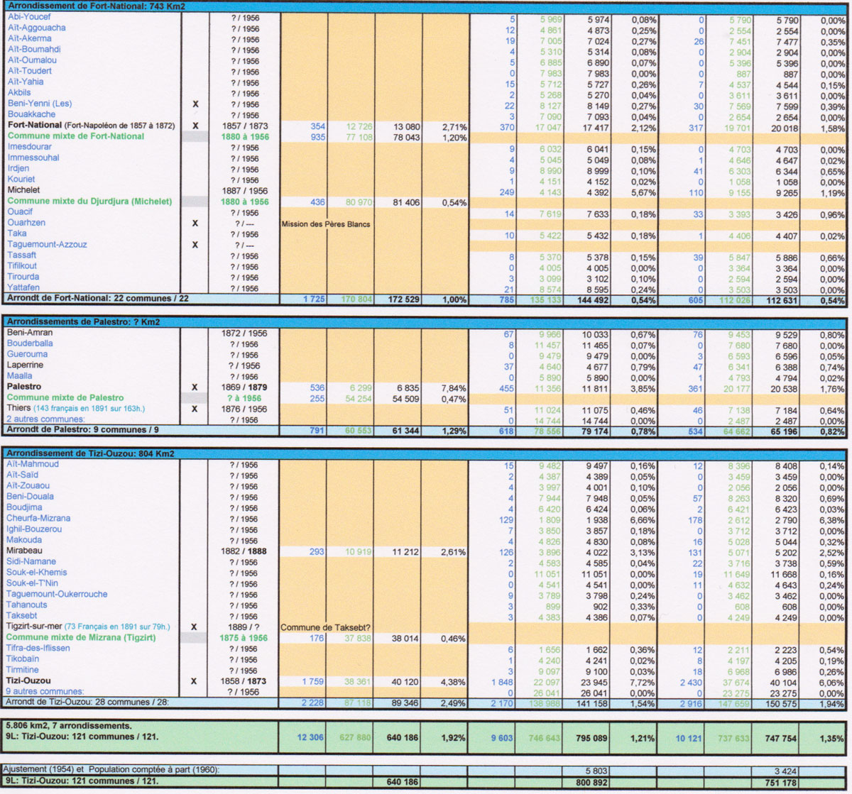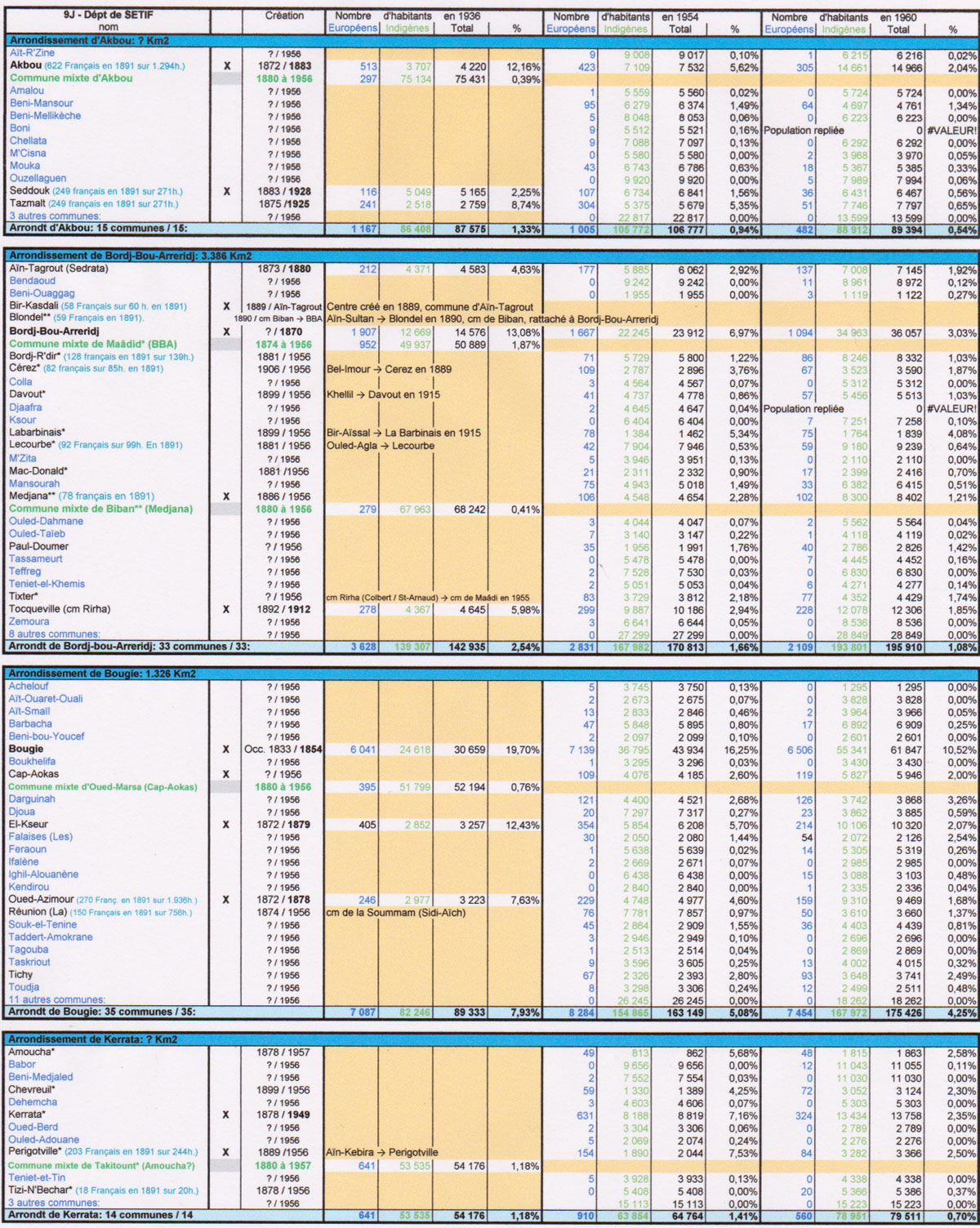 Les tableaux présentés avec les chiffres de 1954 sont choisis arbitrairement avec le découpage correspondant aux années fin 59/60/61/62. Ce découpage n'est ainsi pas conforme à la carte vendue par les établissements Gandini qui reprend plutôt le découpage des années 58/59. Pour équilibrer les pages, j'ai volontairement placé le département de Tizi-Ouzou, qui faisait partie du "91", avec les départements de Bougie et de Sétif de l'ancien département de Constantine. Ci-contre à droite (La carte s'ouvrira dans une nouvelle fenêtre en cliquant dessus), les limites administratives de ces deux départements suivant les décrets du 7 novembre 1959 et 20 février 1961.