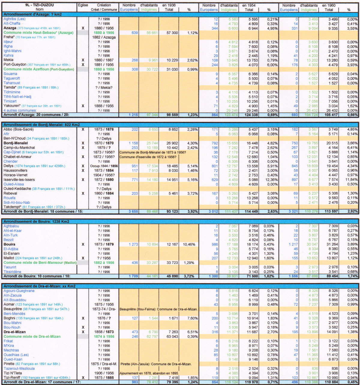 Possédant de très nombreuses cartes des églises d'Algérie, et ayant par le passé fait un certain travail de bibliographie pour recenser la population européenne par commune, j'ai souhaité vous faire partager ce travail de collection et de recherche en les associant. Depuis le 13/02/2014, et les jours suivants, vous retrouvez l'ensemble des lieux de culte sur des pages spécialisées grâce au lien figurant face à la mise sur site de la population du département, ci-dessous. Concernant la population, j'aurais aimé mettre en colonne, à titre de comparaison, celle de 1921, quand le pourcentage des européens fut le plus élevé, et que ceux ci occupaient encore largement les campagnes; mais les chiffres tirés d'un guide bleu de 1930 sont trop irréguliers, et ceux du recensement en ma possession ne font apparaître que la population française, pas la population européenne (Quid des espagnols, italiens, maltais...et des israélites). J'ai complété récemment mes tableaux grâce au dictionnaire des communes de 1960, avec la population de toutes les communes à partir du recensement de 1954. J'y ai relevé quelques coquilles, aussi je fais apparaître, à la fin de chaque département, un "ajustement" permettant de retrouver les chiffres globaux de la population de chacun d'eux. Grâce à la bibliothèque de Bergerac, j'ai aussi obtenu les chiffres du dernier dénombrement de la population de 1960, archivés à Sciences-Po à Paris; la population "comptée à part" est notée à la fin de chaque département. Enfin j'ai volontairement regroupé toutes les communes où il n'était recensé aucun européen sous "Autres communes", pour ne pas alourdir les tableaux.