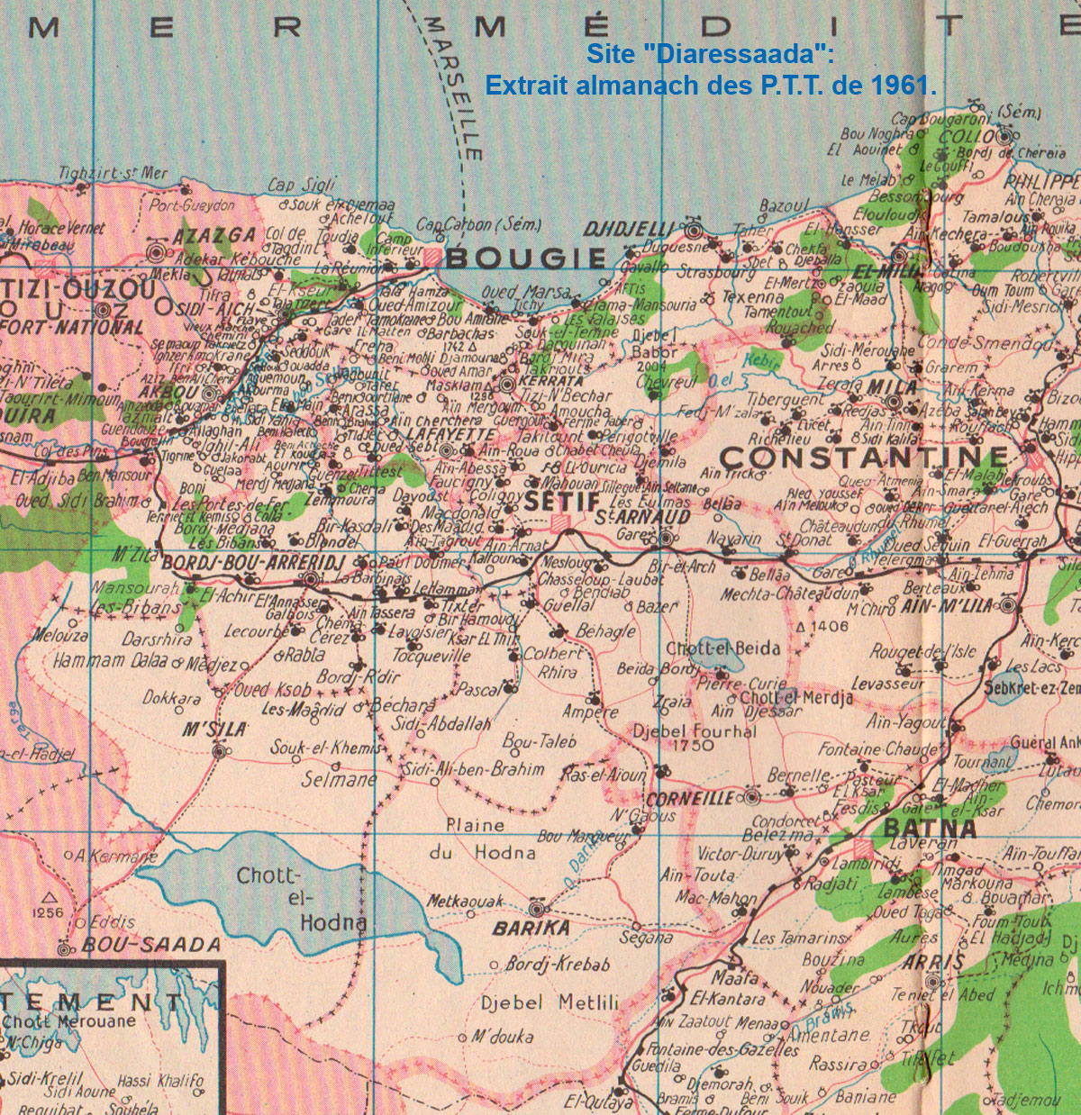 Le département "93" de Constantine, qui exista de 1848 à 1957, fut subdivisé en 4 parties le 28 juin 1956 qui devinrent départements le 20 mai 1957. Le 1er juillet 1957 furent créés les codes 9B "Batna", 9C "Bône", 9D "Constantine" et 9J "Sétif". Le 17 mars 1958 fut créé le département de Bougie ("9P") avec 5 arrondissements du département de Sétif, et 1 (Djidjelli) du département de Constantine. A cette même date l'arrondissement de Barika passa de Batna à Sétif, et l'arrondissement de Tébessa de Bône à Batna. Le 7 novembre 1959 le département de Bougie cessa d'exister et tous les arrondissements retrouvèrent leurs départements d'origine. Ci-contre à droite, un extrait de l'almanach des PTT de 1961, de Sétif et de Bougie.