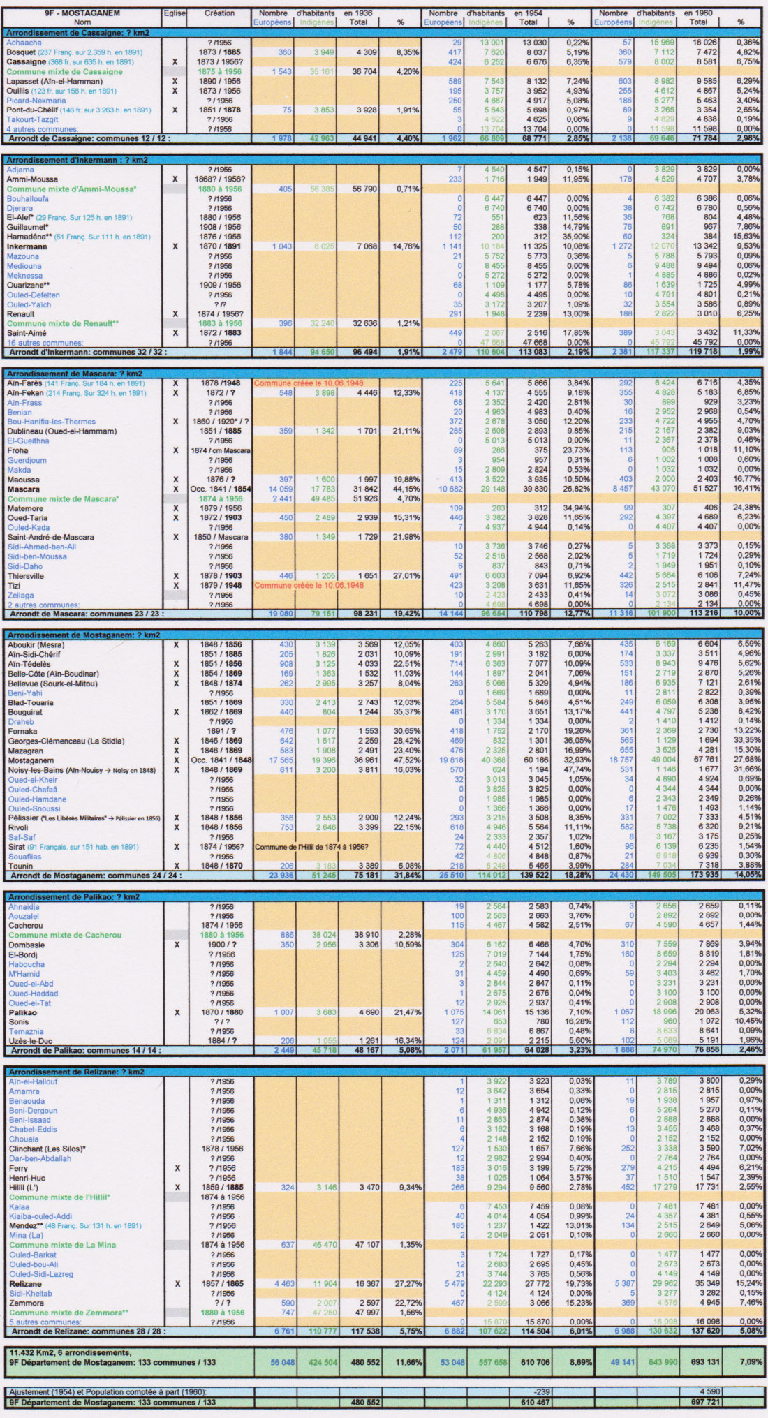 - 1ère colonne: Nom de la commune, éventuellement du lieu-dit (dans ce cas les colonnes "Nombre d'habitants" sont colorées en jaune), éventuellement toujours, avec un autre lieu-dit de la commune possédant aussi une église. Les communes sont classées par arrondissement (en-tête en bleu foncé, récapitulatif en bleu clair avec le nombre de communes décrites / le nombre de communes de l'arrondissement). Les arrondissements sont ensuite classés par département. Les communes mixtes apparaissent en "Vert", avec leur chef-lieu qui peut être aussi une commune de plein droit. Le chef lieu de l'arrondissement est en "gras". J'ai aussi noté parfois la population totale de 1891 avec le nombre de français, mais pas le nombre des étrangers. Les centres de colonisation sont en noir, les villages rattachés à une commune mixte sont en bleu. J'ai aussi noté parfois le premier nom (arabe) du centre de colonisation, et la date de son changement en nom propre français.