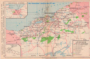 Le département "92" d'Oran, qui exista de 1848 à 1957, fut subdivisé en 4 parties le 28 juin 1956 qui devinrent départements le 20 mai 1957. Le 1er juillet 1957 furent créés les codes 9F "Mostaganem", 9G "Oran", 9K "Tiaret" et 9M "Tlemcen". Le 17 mars 1958 fut créé le département 9R pour Saïda (L'arrondissement de Saïda venant du département de Tiaret, et celui du Télagh du département d'Oran). Les tableaux présentés avec les chiffres de 1936, 1954 et 1960, sont choisis arbitrairement avec le découpage correspondant aux années fin 59/60/61/62. Ce découpage n'est ainsi pas conforme à la carte vendue par les établissements Gandini qui reprend plutôt le découpage des années 58/59. Ci-contre une carte de l'almanach des PTT de 1961 qui s'ouvrira dans une nouvelle fenêtre.