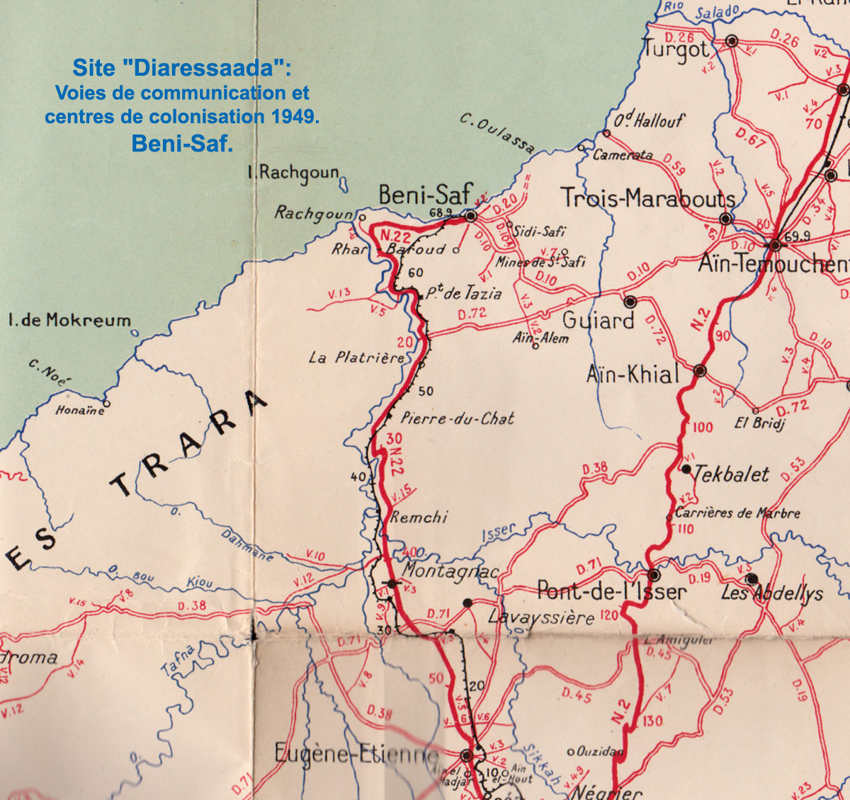 3ème colonne: Dates de création du village et date de passage en commune de plein exercice, d'après un document de la fin du 19ème siècle: "Dictionnaire des communes". En 1891, le village est souvent rattaché à la commune citée. Ou est le centre d'une commune mixte comprenant en outre de nombreux douars, ou est rattaché à une commune mixte (cm). On trouvera rarement une "commune indigène" (ci). Les communes mixtes (79 en 1902, 78 en 1931, 88 en 1950) furent abandonnées par décret du 28 juin 1956, et les principaux villages furent érigés en communes de plein exercice de 1956 à 1962. Ci-contre, communes mixtes d'Aïn-Témouchent et du Télagh.