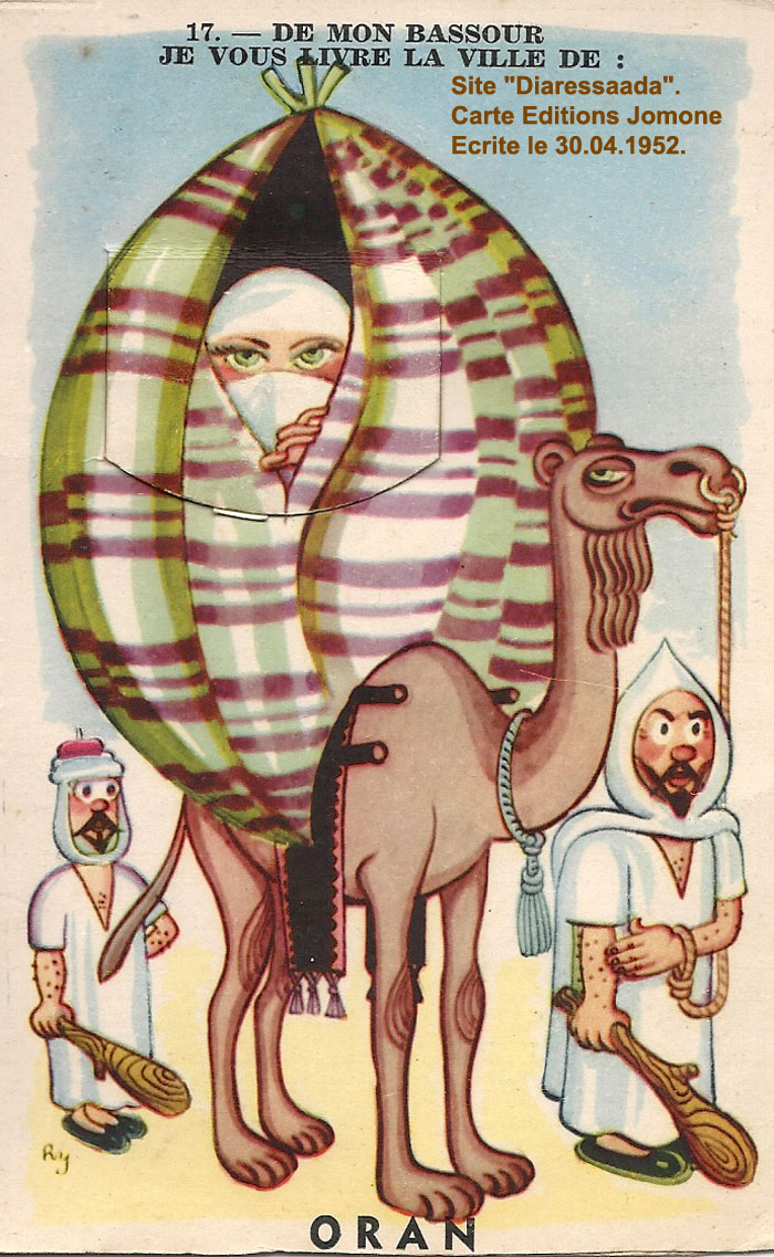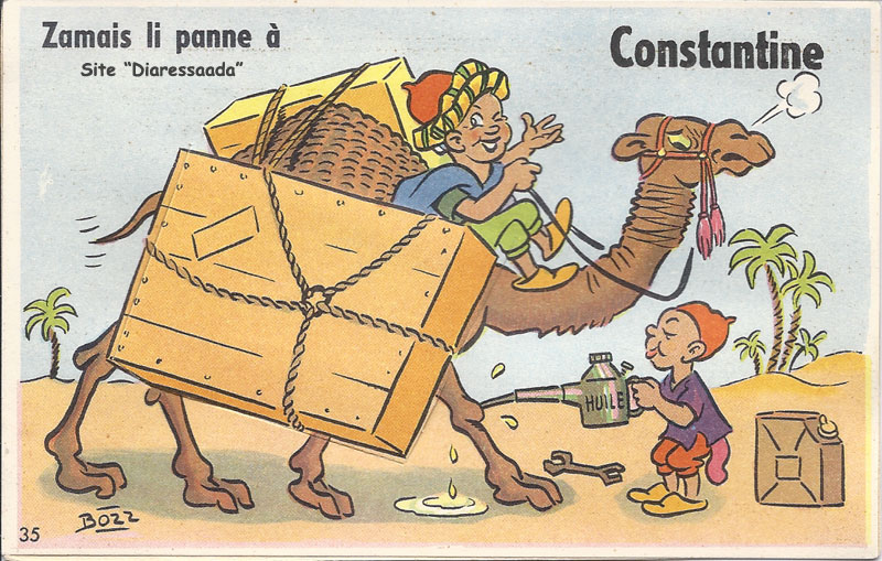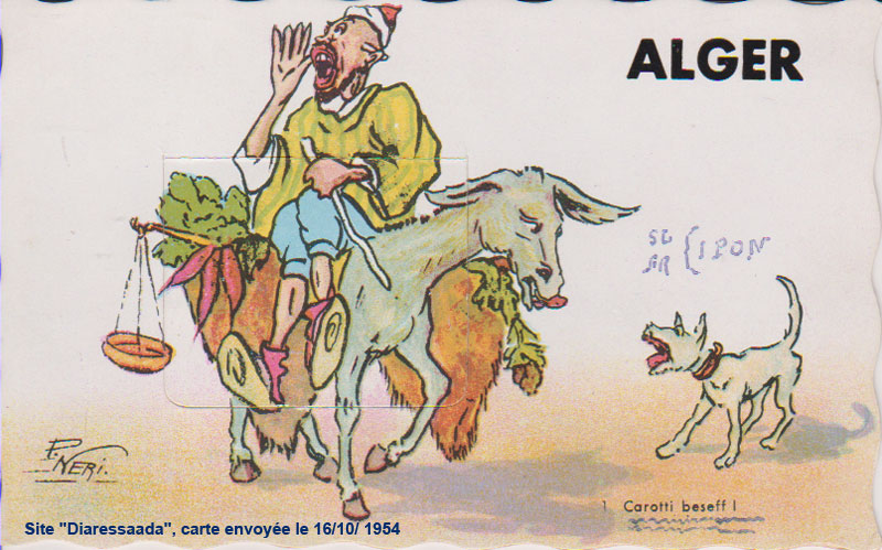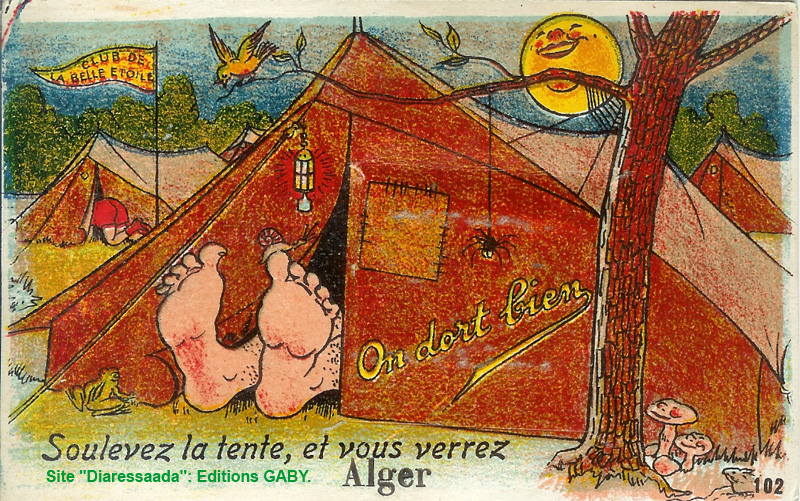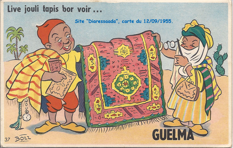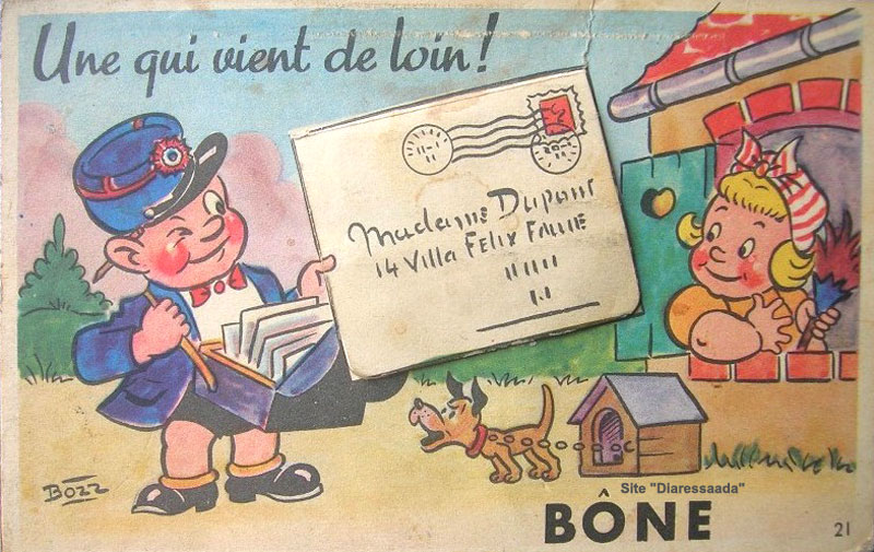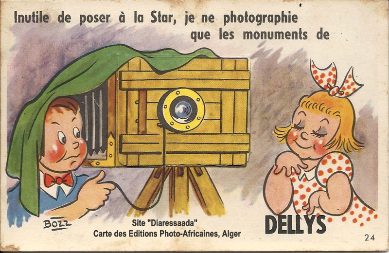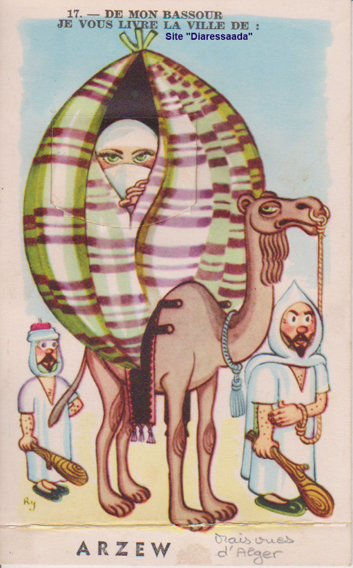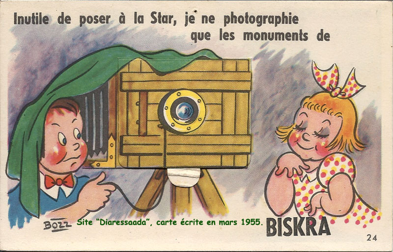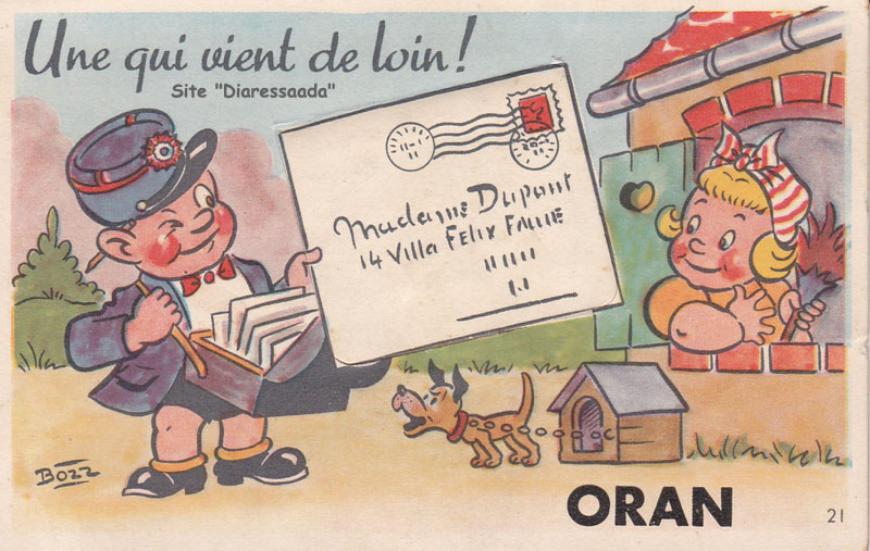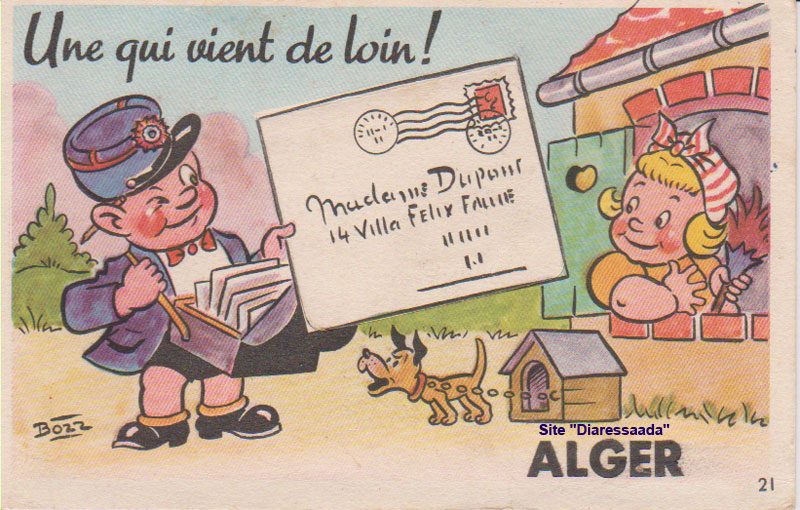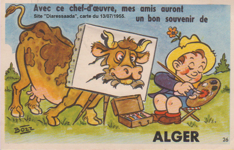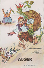 Ajouts: 05.12.2009: 15 cartes: Alger (2), Algérie, Dellys, Djidjelli, Constantine (2), Tlemcen, Sétif, Collo, Colomb-Béchar, Miliana, Philippeville (2), et Sidi-Bel-Abbès. 04.03.2010: 8 cartes: Alger, Aïn-tédélès, Bône, Boufarik, Cherchell, Dellys, Relizane et Saïda. 06.05.10: 2 cartes Alger-Algérie et Oran. 07.06.2010: Ajout de 4 cartes: Alger, Oran, Philippeville et Tébessa. 07.07.2010: Ajout de 5 cartes: Alger, Batna, Oran et Saint-Cloud. 27.07/2010: Ajout de 6 cartes: Chréa, Colomb-Béchar, Médéa, Ménerville, Oran et Sidi-bel-Abbès . 23.10.2010: Ajout de 33 cartes (une dizaine m'a échappé sur Internet!): Alger, Algérie, Biskra, Blida, Bône, Bougie,Collo, Constantine, El-Biar, Guelma, Ménerville, Médéa, Mostaganem , Oran, Philippeville, Sétif et Tizi-Ouzou. 15/12/2010: Bône, Castiglione, Constantine. 11/04/2011: Alger, Algérie, Bône, Bougie, Bouïra, Constantine, Médéa, Philippeville et Tipaza. 28/07/2011: Alger, Azazga, Boufarik, Blida, Cherchell, Colomb-Béchar, Djidjelli, El-Biar, Inkermann, Marnia, Oran, Saint-Cloud. 31.10.2011: 25 nouvelles cartes: Alger (3), Blida (1 refaite), Bône, Collo, Djidjelli , Menerville, Oran(4 dont 1 refaite), Mascara, Perregaux, Sétif, Sidi-bel-Abbès, Tébessa, Tiaret, Tizi-Ouzou. 06.12.2011: 7 nouvelles cartes: Alger, Bougie, Djidjelli, Mascara, Souk-Ahras, Tlemcen. 09.02.2012: 4 nouvelles cartes: Algérie, Djidjelli, Mascara et Sétif. 27.04.2012: Algérie (1), Alger (10), Bône (1), Bougie (2), Bou-Saâda (1), Castiglione (1), Constantine (5), Djidjelli (1), El-Biar (1), Marnia (1), Mascara (1), Ménerville (1), Mostaganem (2), Oran (4), Philippeville (2), Port aux Poules (1). 06.07.2012: Ajout de 27 nouvelles cartes: Algérie (2), Alger (3), Batna (1), Bône (6), Boufarik (1), Constantine (5), El-Biar (3), Guelma (2), Maison-Carrée (1), Mascara (1), Oran (1), Sidi-bel-Abbès (1). 19.08.2012: Ajout de 6 cartes: Algérie (1), Aïn-Sefra (1), Bougie (2), Constantine (1) et Oran (1). 24.02.2013: Ajout de 14 cartes: Azazga (n°27), Biskra (n°37), Collo (n°75), Constantine (n°25), Dellys (n°36), Djidjelli (Mairie), Guelma (n°60), Mostaganem (n°53), Oran (2) (n°21 & n°27), Philippeville (n°1), Relizane (n°44) et Saïda (2) (n°75 & 85). 30.06.2013: Ajout de 11 carte, par ordre alphabétique: Alger (3 dont 2 refaites, n°103 + n°010 & 068), Bou-Saâda (2: n°35 & 38), Constantine (1: n°003), El-Biar (1: n°06), Oran (1: n°008), Philippeville (2: n°093 & n°"1951" refaite), Sétif (n°20), Sidi-bel-Abbès (1 n°39 refaite). 17.09.2013: Ajout de 6 cartes: Algérie (n°100), Azazga (n°11), Inkermann (n°38), Marnia (n°45), Philippeville (n°37), Saïda (n°38). 31.01.2014: Alger (n°15, n°29, "valise","trempette"), Algérie (n°8), Arzew (n°82), Blida (Homme à la valise), Bône ("Dromadaires" et n°27), Bougie (n°4), Castiglione (n°06), Colomb-Béchard (n°38), Constantine ("Vue" et "Dromadaires", refaites, et n°6, n°27 et n°75), Marnia (n°23), Médéa (n°36), Ménerville (n°21), Mostaganem ("Bateau", n°37 et °53), Oran ("Vue", n°14, n°15, "Tente"), Sétif ("Facteur"), Souk-Ahras (n°26), Taher (n°39), Tizi-Ouzou (n°17), Tlemcen (n°35). 23.05.2014: Refonte, ajout d'un tableau de présentation des différents modèles de cartes par éditeur, et ajout de 15 cartes, ci-dessous et dans le tableau général: Algérie (n°31 "Scènes et types"), Alger ("pêche sous-marine"), Batna (n°40), Bône (n°49), Bougie (n°23), Bou-Saâda (n°37), Collo (n°23), Constantine (n°51 et "voyageuse"), Dellys (n°28 et 79), Frenda (n°1), Miliana (n°37), Mostaganem (n°53), Sidi-bel-Abbès (n°41). 28.06.2014: Ajout de 6 cartes, la n°8 CAP dans la présentation des différents modèles, et dans le tableau général par ville: Algérie (n°25), Alger (n°8), Bône (n°38 et n°65), Oran (n°8) et Sétif (n°4). 30/08/2014: Ajout de 2 cartes, la n°91 des éditions Gaby dans la présentation des différents modèles, et par ville, Blida (n°91) et Marnia (n°37). 22/10/2014: Ajout de 13 cartes, la n°72 CAP dans la présentation des différents modèles, ci-dessous, et à Oran, la n°108 Gaby, dans la présentations des différents modèles, ci-dessous, et à Alger, les n° 1, 3 et 9 signées NERI et éditées par CAP, dans la présentation des différents modèles, ci-dessous et à Alger, le "Facteur", dans la présentation des différents modèles sans éditeur, ci-dessous et à Alger, et Alger (n°21 et 49 CAP, Leconte, n°13 Jomone), Arzew (n°17 Jomone), Boufarik (n°13 Jomone), Djidjelli (n°10 Jomone). 23/02/2015: Ajout de 2 cartes ci-dessous dans les différents modèles (1 Delboy, Mostaganem: le garde-champêtre, et 1 Levy & Neurdein, Philippeville, "sur la plage"), et de 17 cartes par ville (immédiatement ci-dessous et par villes): 2 Algérie et "Scènes et types", 1 Alger (n°12 Jomone "Mauresque"), 2 Bouïra et les gorges de Palestro (n° 41 et 43 EPA), 2 Constantine (n°18 Gaby "tacot" et le "facteur"), 1 Gouraya (n°37 EPA), 1 Médéa (vue), 4 Ménerville (n° 22, 36, 37 et 38 CAP), 1 Mostaganem (Garde-champêtre), 1 Philippeville (Levy: "pluie sur la plage"), 1 Taher (n°38 CAP), et 1 Zéralda (n°16 EPA). 03/08/2015: Ajout de 5 cartes ci-dessous dans les différents modèles (1 CAP n°68, 2 Gaby: n°9 "Girouette Coq" et "Marchand de tapis", 1 Neri n°6 "Petit porteur" et 1 n°27 sans auteur "Policier") et de 9 cartes par ville (immédiatement ci-dessous et dans les villes): 2 Algérie (Gaby n°9 "Coq" et n°27 "Policier"), 2 Alger (Néri n°6 "Petit porteur et Gaby "Tapis"), 2 Bône (n°21 et n°68 CAP), 1 Chréa (Narguilé), 1 Saïda (Car), et 1 Sidi-bel-Abbès (Chameau buvant). 03/09/2015: Ajout d'une carte (Néri / Artaud n°5) et à Bou-Saâda. 10/11/2013: Ajout de 7 cartes ci-dessous (CAP n°3 (tente) & n°32 (jumelles)) + MD2 (femme à la TV) + ? (femme à l'appareil photo) + neri (belle Aïcha) + Delboy (écolière) + Gaby n°2 (Hélicoptère)) dans les différents modèles et de 31 car
