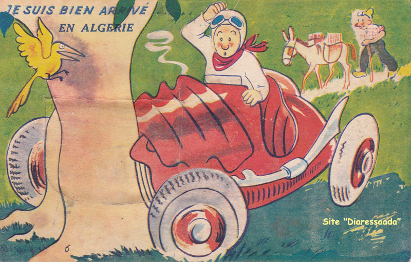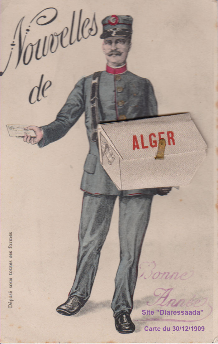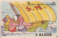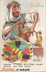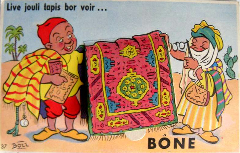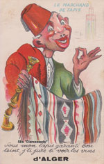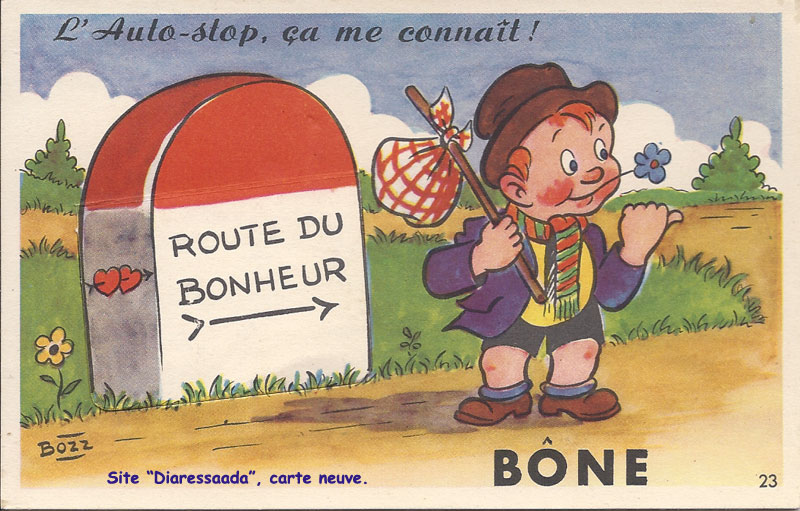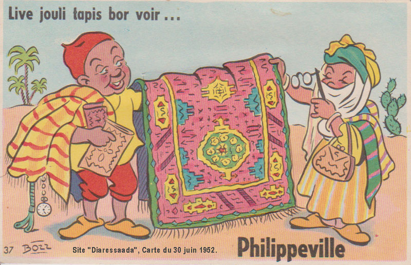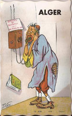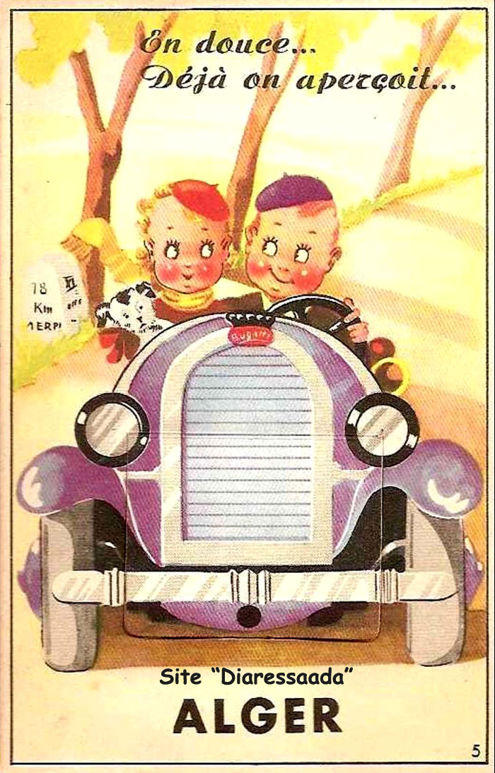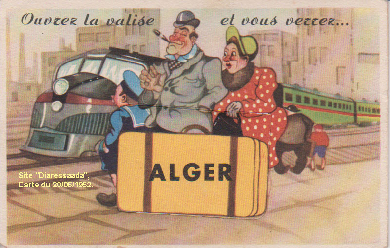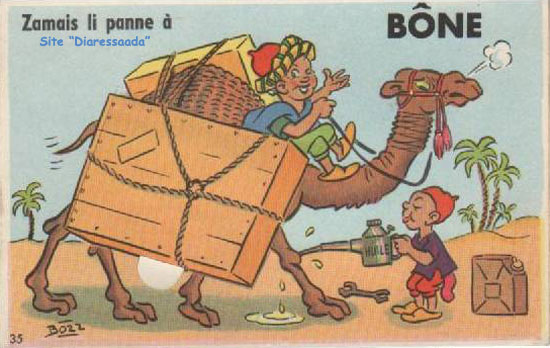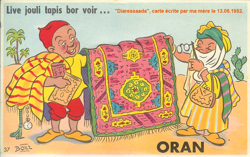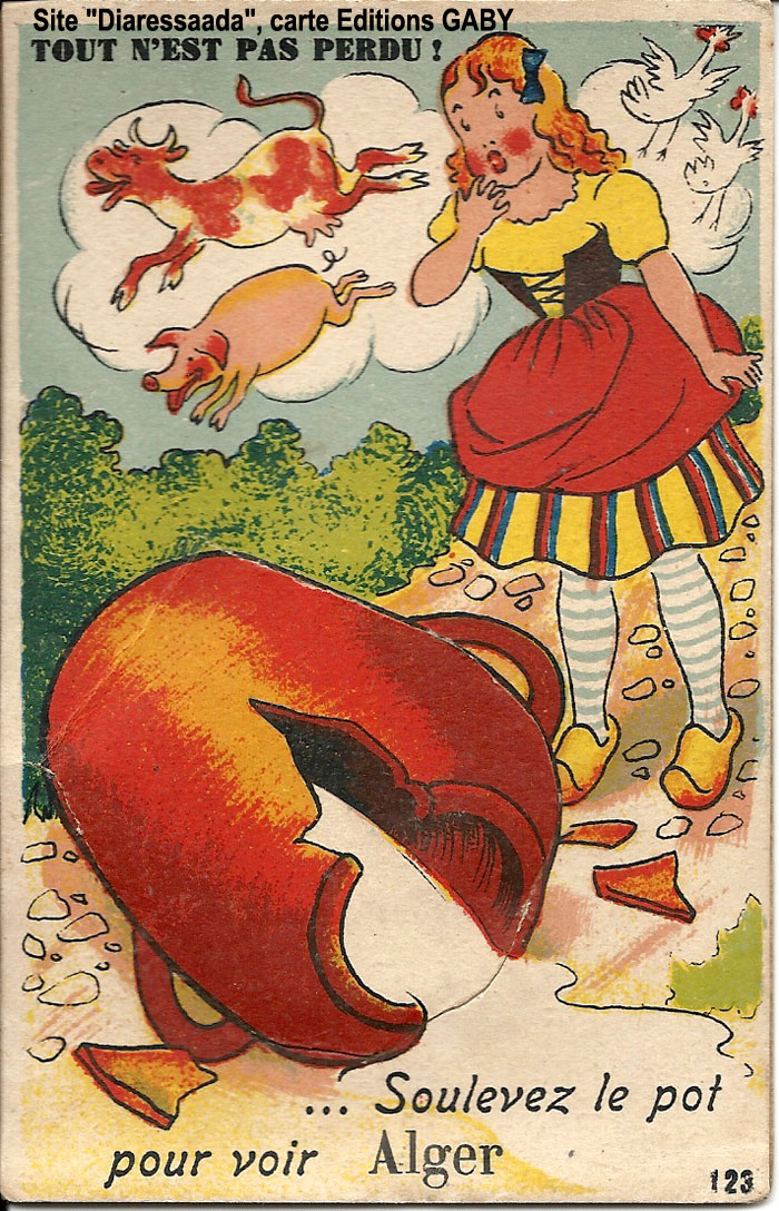 Ajouts: 05.12.2009: 15 cartes: Alger (2), Algérie, Dellys, Djidjelli, Constantine (2), Tlemcen, Sétif, Collo, Colomb-Béchar, Miliana, Philippeville (2), et Sidi-Bel-Abbès. 04.03.2010: 8 cartes: Alger, Aïn-tédélès, Bône, Boufarik, Cherchell, Dellys, Relizane et Saïda. 06.05.10: 2 cartes Alger-Algérie et Oran. 07.06.2010: Ajout de 4 cartes: Alger, Oran, Philippeville et Tébessa. 07.07.2010: Ajout de 5 cartes: Alger, Batna, Oran et Saint-Cloud. 27.07/2010: Ajout de 6 cartes: Chréa, Colomb-Béchar, Médéa, Ménerville, Oran et Sidi-bel-Abbès . 23.10.2010: Ajout de 33 cartes (une dizaine m'a échappé sur Internet!): Alger, Algérie, Biskra, Blida, Bône, Bougie,Collo, Constantine, El-Biar, Guelma, Ménerville, Médéa, Mostaganem , Oran, Philippeville, Sétif et Tizi-Ouzou. 15/12/2010: Bône, Castiglione, Constantine. 11/04/2011: Alger, Algérie, Bône, Bougie, Bouïra, Constantine, Médéa, Philippeville et Tipaza. 28/07/2011: Alger, Azazga, Boufarik, Blida, Cherchell, Colomb-Béchar, Djidjelli, El-Biar, Inkermann, Marnia, Oran, Saint-Cloud. 31.10.2011: 25 nouvelles cartes: Alger (3), Blida (1 refaite), Bône, Collo, Djidjelli , Menerville, Oran(4 dont 1 refaite), Mascara, Perregaux, Sétif, Sidi-bel-Abbès, Tébessa, Tiaret, Tizi-Ouzou. 06.12.2011: 7 nouvelles cartes: Alger, Bougie, Djidjelli, Mascara, Souk-Ahras, Tlemcen. 09.02.2012: 4 nouvelles cartes: Algérie, Djidjelli, Mascara et Sétif. 27.04.2012: Algérie (1), Alger (10), Bône (1), Bougie (2), Bou-Saâda (1), Castiglione (1), Constantine (5), Djidjelli (1), El-Biar (1), Marnia (1), Mascara (1), Ménerville (1), Mostaganem (2), Oran (4), Philippeville (2), Port aux Poules (1). 06.07.2012: Ajout de 27 nouvelles cartes: Algérie (2), Alger (3), Batna (1), Bône (6), Boufarik (1), Constantine (5), El-Biar (3), Guelma (2), Maison-Carrée (1), Mascara (1), Oran (1), Sidi-bel-Abbès (1). 19.08.2012: Ajout de 6 cartes: Algérie (1), Aïn-Sefra (1), Bougie (2), Constantine (1) et Oran (1). 24.02.2013: Ajout de 14 cartes: Azazga (n°27), Biskra (n°37), Collo (n°75), Constantine (n°25), Dellys (n°36), Djidjelli (Mairie), Guelma (n°60), Mostaganem (n°53), Oran (2) (n°21 & n°27), Philippeville (n°1), Relizane (n°44) et Saïda (2) (n°75 & 85). 30.06.2013: Ajout de 11 carte, par ordre alphabétique: Alger (3 dont 2 refaites, n°103 + n°010 & 068), Bou-Saâda (2: n°35 & 38), Constantine (1: n°003), El-Biar (1: n°06), Oran (1: n°008), Philippeville (2: n°093 & n°"1951" refaite), Sétif (n°20), Sidi-bel-Abbès (1 n°39 refaite). 17.09.2013: Ajout de 6 cartes: Algérie (n°100), Azazga (n°11), Inkermann (n°38), Marnia (n°45), Philippeville (n°37), Saïda (n°38). 31.01.2014: Alger (n°15, n°29, "valise","trempette"), Algérie (n°8), Arzew (n°82), Blida (Homme à la valise), Bône ("Dromadaires" et n°27), Bougie (n°4), Castiglione (n°06), Colomb-Béchard (n°38), Constantine ("Vue" et "Dromadaires", refaites, et n°6, n°27 et n°75), Marnia (n°23), Médéa (n°36), Ménerville (n°21), Mostaganem ("Bateau", n°37 et °53), Oran ("Vue", n°14, n°15, "Tente"), Sétif ("Facteur"), Souk-Ahras (n°26), Taher (n°39), Tizi-Ouzou (n°17), Tlemcen (n°35). 23.05.2014: Refonte, ajout d'un tableau de présentation des différents modèles de cartes par éditeur, et ajout de 15 cartes, ci-dessous et dans le tableau général: Algérie (n°31 "Scènes et types"), Alger ("pêche sous-marine"), Batna (n°40), Bône (n°49), Bougie (n°23), Bou-Saâda (n°37), Collo (n°23), Constantine (n°51 et "voyageuse"), Dellys (n°28 et 79), Frenda (n°1), Miliana (n°37), Mostaganem (n°53), Sidi-bel-Abbès (n°41). 28.06.2014: Ajout de 6 cartes, la n°8 CAP dans la présentation des différents modèles, et dans le tableau général par ville: Algérie (n°25), Alger (n°8), Bône (n°38 et n°65), Oran (n°8) et Sétif (n°4). 30/08/2014: Ajout de 2 cartes, la n°91 des éditions Gaby dans la présentation des différents modèles, et par ville, Blida (n°91) et Marnia (n°37). 22/10/2014: Ajout de 13 cartes, la n°72 CAP dans la présentation des différents modèles, ci-dessous, et à Oran, la n°108 Gaby, dans la présentations des différents modèles, ci-dessous, et à Alger, les n° 1, 3 et 9 signées NERI et éditées par CAP, dans la présentation des différents modèles, ci-dessous et à Alger, le "Facteur", dans la présentation des différents modèles sans éditeur, ci-dessous et à Alger, et Alger (n°21 et 49 CAP, Leconte, n°13 Jomone), Arzew (n°17 Jomone), Boufarik (n°13 Jomone), Djidjelli (n°10 Jomone). 23/02/2015: Ajout de 2 cartes ci-dessous dans les différents modèles (1 Delboy, Mostaganem: le garde-champêtre, et 1 Levy & Neurdein, Philippeville, "sur la plage"), et de 17 cartes par ville (immédiatement ci-dessous et par villes): 2 Algérie et "Scènes et types", 1 Alger (n°12 Jomone "Mauresque"), 2 Bouïra et les gorges de Palestro (n° 41 et 43 EPA), 2 Constantine (n°18 Gaby "tacot" et le "facteur"), 1 Gouraya (n°37 EPA), 1 Médéa (vue), 4 Ménerville (n° 22, 36, 37 et 38 CAP), 1 Mostaganem (Garde-champêtre), 1 Philippeville (Levy: "pluie sur la plage"), 1 Taher (n°38 CAP), et 1 Zéralda (n°16 EPA). 03/08/2015: Ajout de 5 cartes ci-dessous dans les différents modèles (1 CAP n°68, 2 Gaby: n°9 "Girouette Coq" et "Marchand de tapis", 1 Neri n°6 "Petit porteur" et 1 n°27 sans auteur "Policier") et de 9 cartes par ville (immédiatement ci-dessous et dans les villes): 2 Algérie (Gaby n°9 "Coq" et n°27 "Policier"), 2 Alger (Néri n°6 "Petit porteur et Gaby "Tapis"), 2 Bône (n°21 et n°68 CAP), 1 Chréa (Narguilé), 1 Saïda (Car), et 1 Sidi-bel-Abbès (Chameau buvant). 03/09/2015: Ajout d'une carte (Néri / Artaud n°5) et à Bou-Saâda. 10/11/2013: Ajout de 7 cartes ci-dessous (CAP n°3 (tente) & n°32 (jumelles)) + MD2 (femme à la TV) + ? (femme à l'appareil photo) + neri (belle Aïcha) + Delboy (écolière) + Gaby n°2 (Hélicoptère)) dans les différents modèles et de 31 car
