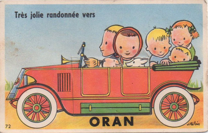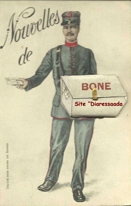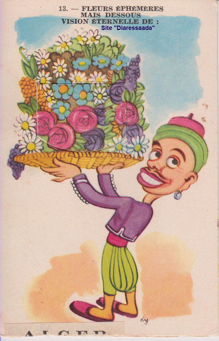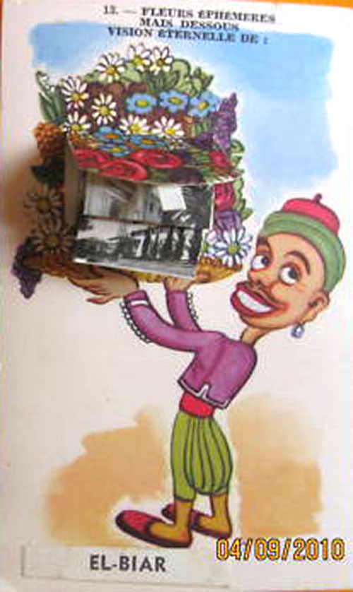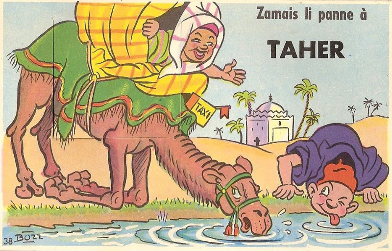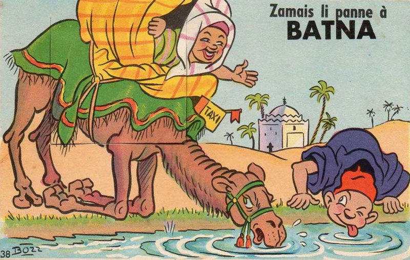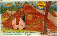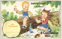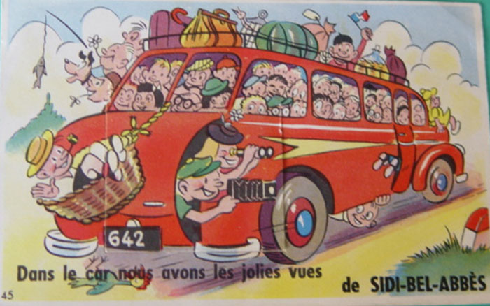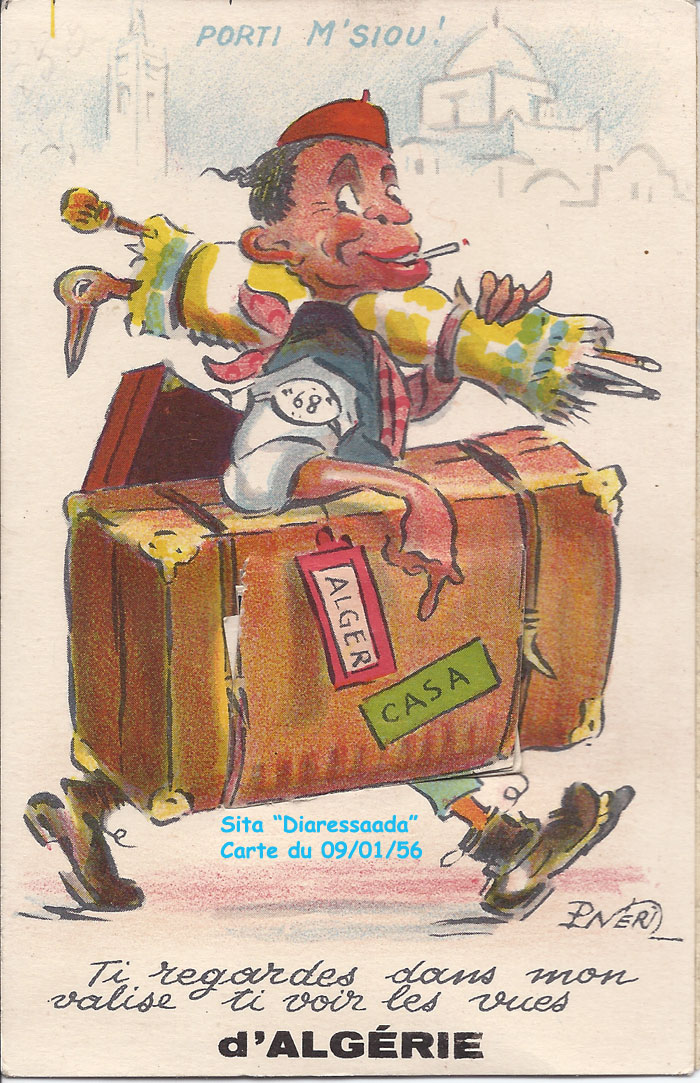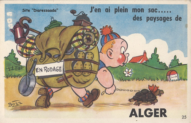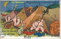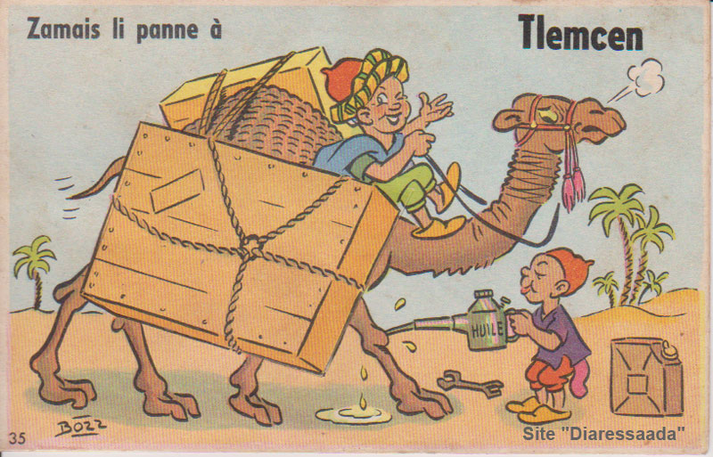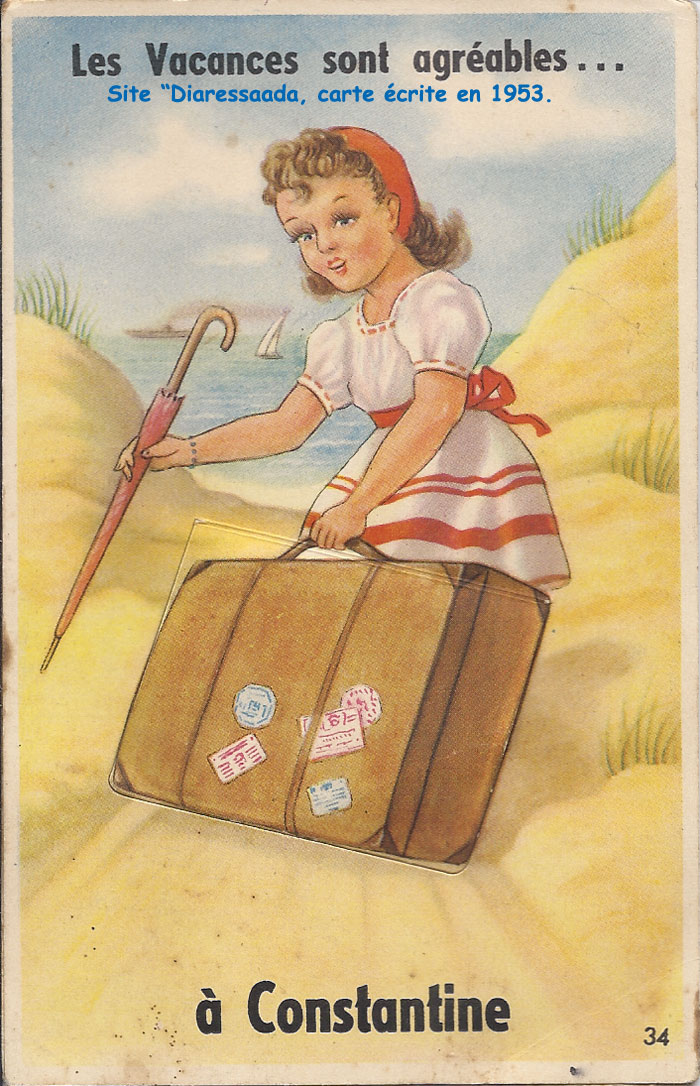 Ajouts: 05.12.2009: 15 cartes: Alger (2), Algérie, Dellys, Djidjelli, Constantine (2), Tlemcen, Sétif, Collo, Colomb-Béchar, Miliana, Philippeville (2), et Sidi-Bel-Abbès. 04.03.2010: 8 cartes: Alger, Aïn-tédélès, Bône, Boufarik, Cherchell, Dellys, Relizane et Saïda. 06.05.10: 2 cartes Alger-Algérie et Oran. 07.06.2010: Ajout de 4 cartes: Alger, Oran, Philippeville et Tébessa. 07.07.2010: Ajout de 5 cartes: Alger, Batna, Oran et Saint-Cloud. 27.07/2010: Ajout de 6 cartes: Chréa, Colomb-Béchar, Médéa, Ménerville, Oran et Sidi-bel-Abbès . 23.10.2010: Ajout de 33 cartes (une dizaine m'a échappé sur Internet!): Alger, Algérie, Biskra, Blida, Bône, Bougie,Collo, Constantine, El-Biar, Guelma, Ménerville, Médéa, Mostaganem , Oran, Philippeville, Sétif et Tizi-Ouzou. 15/12/2010: Bône, Castiglione, Constantine. 11/04/2011: Alger, Algérie, Bône, Bougie, Bouïra, Constantine, Médéa, Philippeville et Tipaza. 28/07/2011: Alger, Azazga, Boufarik, Blida, Cherchell, Colomb-Béchar, Djidjelli, El-Biar, Inkermann, Marnia, Oran, Saint-Cloud. 31.10.2011: 25 nouvelles cartes: Alger (3), Blida (1 refaite), Bône, Collo, Djidjelli , Menerville, Oran(4 dont 1 refaite), Mascara, Perregaux, Sétif, Sidi-bel-Abbès, Tébessa, Tiaret, Tizi-Ouzou. 06.12.2011: 7 nouvelles cartes: Alger, Bougie, Djidjelli, Mascara, Souk-Ahras, Tlemcen. 09.02.2012: 4 nouvelles cartes: Algérie, Djidjelli, Mascara et Sétif. 27.04.2012: Algérie (1), Alger (10), Bône (1), Bougie (2), Bou-Saâda (1), Castiglione (1), Constantine (5), Djidjelli (1), El-Biar (1), Marnia (1), Mascara (1), Ménerville (1), Mostaganem (2), Oran (4), Philippeville (2), Port aux Poules (1). 06.07.2012: Ajout de 27 nouvelles cartes: Algérie (2), Alger (3), Batna (1), Bône (6), Boufarik (1), Constantine (5), El-Biar (3), Guelma (2), Maison-Carrée (1), Mascara (1), Oran (1), Sidi-bel-Abbès (1). 19.08.2012: Ajout de 6 cartes: Algérie (1), Aïn-Sefra (1), Bougie (2), Constantine (1) et Oran (1). 24.02.2013: Ajout de 14 cartes: Azazga (n°27), Biskra (n°37), Collo (n°75), Constantine (n°25), Dellys (n°36), Djidjelli (Mairie), Guelma (n°60), Mostaganem (n°53), Oran (2) (n°21 & n°27), Philippeville (n°1), Relizane (n°44) et Saïda (2) (n°75 & 85). 30.06.2013: Ajout de 11 carte, par ordre alphabétique: Alger (3 dont 2 refaites, n°103 + n°010 & 068), Bou-Saâda (2: n°35 & 38), Constantine (1: n°003), El-Biar (1: n°06), Oran (1: n°008), Philippeville (2: n°093 & n°"1951" refaite), Sétif (n°20), Sidi-bel-Abbès (1 n°39 refaite). 17.09.2013: Ajout de 6 cartes: Algérie (n°100), Azazga (n°11), Inkermann (n°38), Marnia (n°45), Philippeville (n°37), Saïda (n°38). 31.01.2014: Alger (n°15, n°29, "valise","trempette"), Algérie (n°8), Arzew (n°82), Blida (Homme à la valise), Bône ("Dromadaires" et n°27), Bougie (n°4), Castiglione (n°06), Colomb-Béchard (n°38), Constantine ("Vue" et "Dromadaires", refaites, et n°6, n°27 et n°75), Marnia (n°23), Médéa (n°36), Ménerville (n°21), Mostaganem ("Bateau", n°37 et °53), Oran ("Vue", n°14, n°15, "Tente"), Sétif ("Facteur"), Souk-Ahras (n°26), Taher (n°39), Tizi-Ouzou (n°17), Tlemcen (n°35). 23.05.2014: Refonte, ajout d'un tableau de présentation des différents modèles de cartes par éditeur, et ajout de 15 cartes, ci-dessous et dans le tableau général: Algérie (n°31 "Scènes et types"), Alger ("pêche sous-marine"), Batna (n°40), Bône (n°49), Bougie (n°23), Bou-Saâda (n°37), Collo (n°23), Constantine (n°51 et "voyageuse"), Dellys (n°28 et 79), Frenda (n°1), Miliana (n°37), Mostaganem (n°53), Sidi-bel-Abbès (n°41). 28.06.2014: Ajout de 6 cartes, la n°8 CAP dans la présentation des différents modèles, et dans le tableau général par ville: Algérie (n°25), Alger (n°8), Bône (n°38 et n°65), Oran (n°8) et Sétif (n°4). 30/08/2014: Ajout de 2 cartes, la n°91 des éditions Gaby dans la présentation des différents modèles, et par ville, Blida (n°91) et Marnia (n°37). 22/10/2014: Ajout de 13 cartes, la n°72 CAP dans la présentation des différents modèles, ci-dessous, et à Oran, la n°108 Gaby, dans la présentations des différents modèles, ci-dessous, et à Alger, les n° 1, 3 et 9 signées NERI et éditées par CAP, dans la présentation des différents modèles, ci-dessous et à Alger, le "Facteur", dans la présentation des différents modèles sans éditeur, ci-dessous et à Alger, et Alger (n°21 et 49 CAP, Leconte, n°13 Jomone), Arzew (n°17 Jomone), Boufarik (n°13 Jomone), Djidjelli (n°10 Jomone). 23/02/2015: Ajout de 2 cartes ci-dessous dans les différents modèles (1 Delboy, Mostaganem: le garde-champêtre, et 1 Levy & Neurdein, Philippeville, "sur la plage"), et de 17 cartes par ville (immédiatement ci-dessous et par villes): 2 Algérie et "Scènes et types", 1 Alger (n°12 Jomone "Mauresque"), 2 Bouïra et les gorges de Palestro (n° 41 et 43 EPA), 2 Constantine (n°18 Gaby "tacot" et le "facteur"), 1 Gouraya (n°37 EPA), 1 Médéa (vue), 4 Ménerville (n° 22, 36, 37 et 38 CAP), 1 Mostaganem (Garde-champêtre), 1 Philippeville (Levy: "pluie sur la plage"), 1 Taher (n°38 CAP), et 1 Zéralda (n°16 EPA). 03/08/2015: Ajout de 5 cartes ci-dessous dans les différents modèles (1 CAP n°68, 2 Gaby: n°9 "Girouette Coq" et "Marchand de tapis", 1 Neri n°6 "Petit porteur" et 1 n°27 sans auteur "Policier") et de 9 cartes par ville (immédiatement ci-dessous et dans les villes): 2 Algérie (Gaby n°9 "Coq" et n°27 "Policier"), 2 Alger (Néri n°6 "Petit porteur et Gaby "Tapis"), 2 Bône (n°21 et n°68 CAP), 1 Chréa (Narguilé), 1 Saïda (Car), et 1 Sidi-bel-Abbès (Chameau buvant). 03/09/2015: Ajout d'une carte (Néri / Artaud n°5) et à Bou-Saâda. 10/11/2013: Ajout de 7 cartes ci-dessous (CAP n°3 (tente) & n°32 (jumelles)) + MD2 (femme à la TV) + ? (femme à l'appareil photo) + neri (belle Aïcha) + Delboy (écolière) + Gaby n°2 (Hélicoptère)) dans les différents modèles et de 31 car