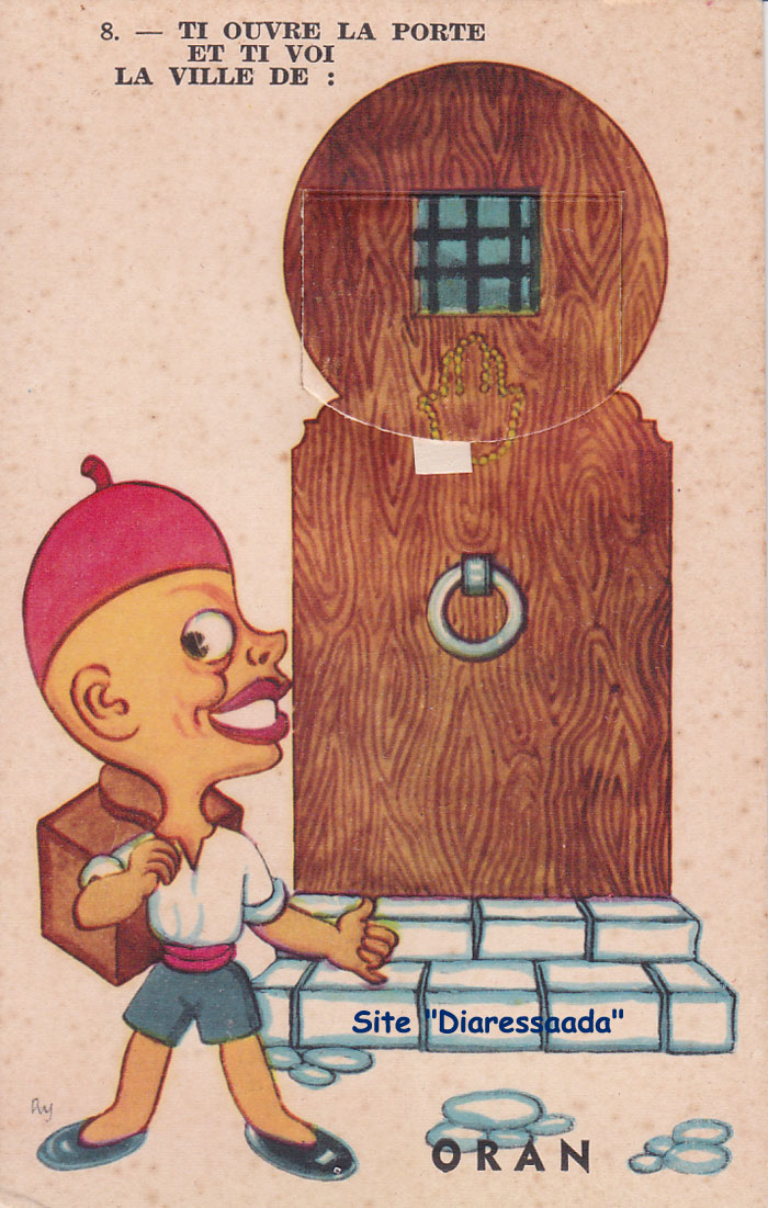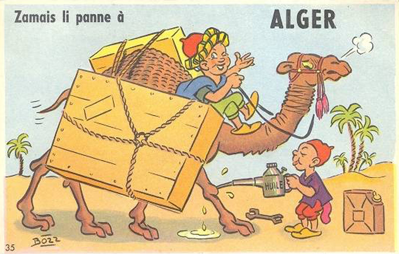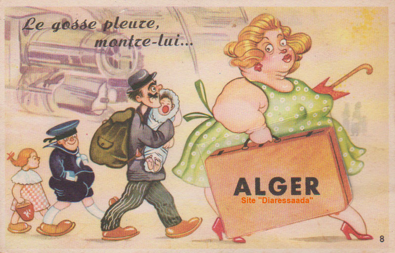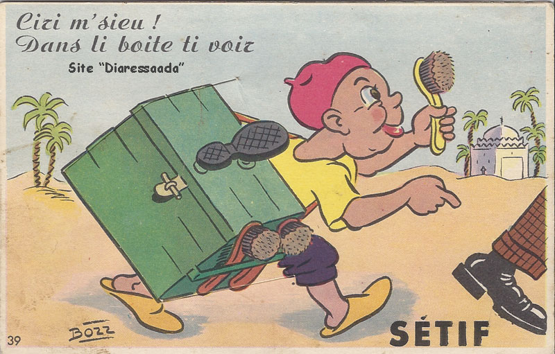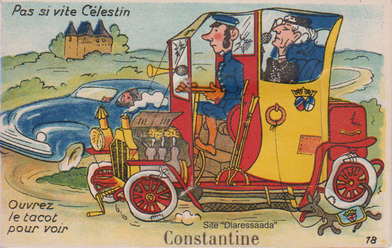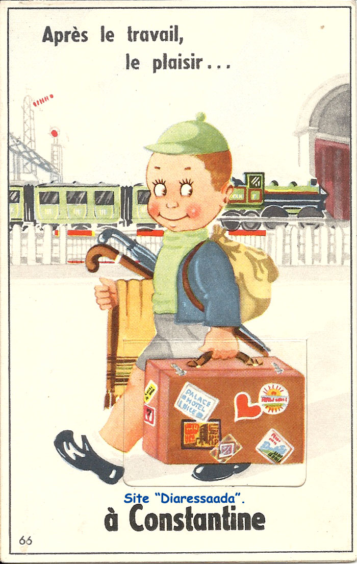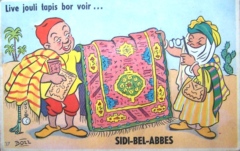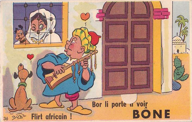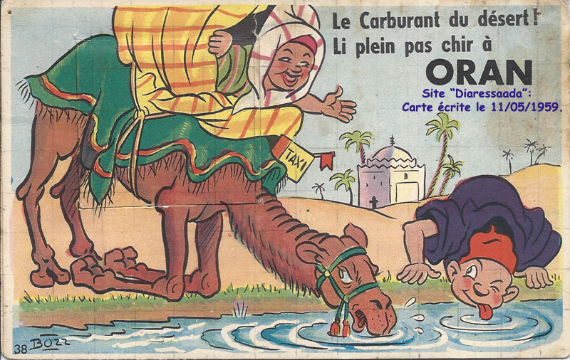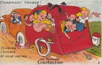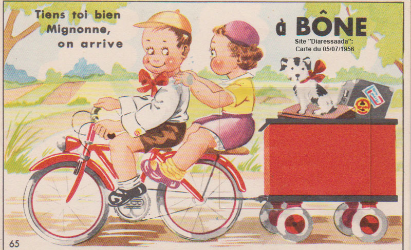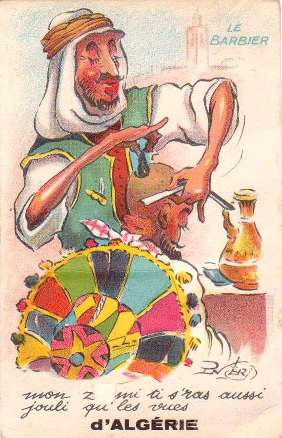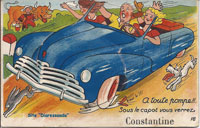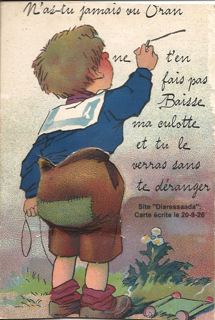 Ajouts: 05.12.2009: 15 cartes: Alger (2), Algérie, Dellys, Djidjelli, Constantine (2), Tlemcen, Sétif, Collo, Colomb-Béchar, Miliana, Philippeville (2), et Sidi-Bel-Abbès. 04.03.2010: 8 cartes: Alger, Aïn-tédélès, Bône, Boufarik, Cherchell, Dellys, Relizane et Saïda. 06.05.10: 2 cartes Alger-Algérie et Oran. 07.06.2010: Ajout de 4 cartes: Alger, Oran, Philippeville et Tébessa. 07.07.2010: Ajout de 5 cartes: Alger, Batna, Oran et Saint-Cloud. 27.07/2010: Ajout de 6 cartes: Chréa, Colomb-Béchar, Médéa, Ménerville, Oran et Sidi-bel-Abbès . 23.10.2010: Ajout de 33 cartes (une dizaine m'a échappé sur Internet!): Alger, Algérie, Biskra, Blida, Bône, Bougie,Collo, Constantine, El-Biar, Guelma, Ménerville, Médéa, Mostaganem , Oran, Philippeville, Sétif et Tizi-Ouzou. 15/12/2010: Bône, Castiglione, Constantine. 11/04/2011: Alger, Algérie, Bône, Bougie, Bouïra, Constantine, Médéa, Philippeville et Tipaza. 28/07/2011: Alger, Azazga, Boufarik, Blida, Cherchell, Colomb-Béchar, Djidjelli, El-Biar, Inkermann, Marnia, Oran, Saint-Cloud. 31.10.2011: 25 nouvelles cartes: Alger (3), Blida (1 refaite), Bône, Collo, Djidjelli , Menerville, Oran(4 dont 1 refaite), Mascara, Perregaux, Sétif, Sidi-bel-Abbès, Tébessa, Tiaret, Tizi-Ouzou. 06.12.2011: 7 nouvelles cartes: Alger, Bougie, Djidjelli, Mascara, Souk-Ahras, Tlemcen. 09.02.2012: 4 nouvelles cartes: Algérie, Djidjelli, Mascara et Sétif. 27.04.2012: Algérie (1), Alger (10), Bône (1), Bougie (2), Bou-Saâda (1), Castiglione (1), Constantine (5), Djidjelli (1), El-Biar (1), Marnia (1), Mascara (1), Ménerville (1), Mostaganem (2), Oran (4), Philippeville (2), Port aux Poules (1). 06.07.2012: Ajout de 27 nouvelles cartes: Algérie (2), Alger (3), Batna (1), Bône (6), Boufarik (1), Constantine (5), El-Biar (3), Guelma (2), Maison-Carrée (1), Mascara (1), Oran (1), Sidi-bel-Abbès (1). 19.08.2012: Ajout de 6 cartes: Algérie (1), Aïn-Sefra (1), Bougie (2), Constantine (1) et Oran (1). 24.02.2013: Ajout de 14 cartes: Azazga (n°27), Biskra (n°37), Collo (n°75), Constantine (n°25), Dellys (n°36), Djidjelli (Mairie), Guelma (n°60), Mostaganem (n°53), Oran (2) (n°21 & n°27), Philippeville (n°1), Relizane (n°44) et Saïda (2) (n°75 & 85). 30.06.2013: Ajout de 11 carte, par ordre alphabétique: Alger (3 dont 2 refaites, n°103 + n°010 & 068), Bou-Saâda (2: n°35 & 38), Constantine (1: n°003), El-Biar (1: n°06), Oran (1: n°008), Philippeville (2: n°093 & n°"1951" refaite), Sétif (n°20), Sidi-bel-Abbès (1 n°39 refaite). 17.09.2013: Ajout de 6 cartes: Algérie (n°100), Azazga (n°11), Inkermann (n°38), Marnia (n°45), Philippeville (n°37), Saïda (n°38). 31.01.2014: Alger (n°15, n°29, "valise","trempette"), Algérie (n°8), Arzew (n°82), Blida (Homme à la valise), Bône ("Dromadaires" et n°27), Bougie (n°4), Castiglione (n°06), Colomb-Béchard (n°38), Constantine ("Vue" et "Dromadaires", refaites, et n°6, n°27 et n°75), Marnia (n°23), Médéa (n°36), Ménerville (n°21), Mostaganem ("Bateau", n°37 et °53), Oran ("Vue", n°14, n°15, "Tente"), Sétif ("Facteur"), Souk-Ahras (n°26), Taher (n°39), Tizi-Ouzou (n°17), Tlemcen (n°35). 23.05.2014: Refonte, ajout d'un tableau de présentation des différents modèles de cartes par éditeur, et ajout de 15 cartes, ci-dessous et dans le tableau général: Algérie (n°31 "Scènes et types"), Alger ("pêche sous-marine"), Batna (n°40), Bône (n°49), Bougie (n°23), Bou-Saâda (n°37), Collo (n°23), Constantine (n°51 et "voyageuse"), Dellys (n°28 et 79), Frenda (n°1), Miliana (n°37), Mostaganem (n°53), Sidi-bel-Abbès (n°41). 28.06.2014: Ajout de 6 cartes, la n°8 CAP dans la présentation des différents modèles, et dans le tableau général par ville: Algérie (n°25), Alger (n°8), Bône (n°38 et n°65), Oran (n°8) et Sétif (n°4). 30/08/2014: Ajout de 2 cartes, la n°91 des éditions Gaby dans la présentation des différents modèles, et par ville, Blida (n°91) et Marnia (n°37). 22/10/2014: Ajout de 13 cartes, la n°72 CAP dans la présentation des différents modèles, ci-dessous, et à Oran, la n°108 Gaby, dans la présentations des différents modèles, ci-dessous, et à Alger, les n° 1, 3 et 9 signées NERI et éditées par CAP, dans la présentation des différents modèles, ci-dessous et à Alger, le "Facteur", dans la présentation des différents modèles sans éditeur, ci-dessous et à Alger, et Alger (n°21 et 49 CAP, Leconte, n°13 Jomone), Arzew (n°17 Jomone), Boufarik (n°13 Jomone), Djidjelli (n°10 Jomone). 23/02/2015: Ajout de 2 cartes ci-dessous dans les différents modèles (1 Delboy, Mostaganem: le garde-champêtre, et 1 Levy & Neurdein, Philippeville, "sur la plage"), et de 17 cartes par ville (immédiatement ci-dessous et par villes): 2 Algérie et "Scènes et types", 1 Alger (n°12 Jomone "Mauresque"), 2 Bouïra et les gorges de Palestro (n° 41 et 43 EPA), 2 Constantine (n°18 Gaby "tacot" et le "facteur"), 1 Gouraya (n°37 EPA), 1 Médéa (vue), 4 Ménerville (n° 22, 36, 37 et 38 CAP), 1 Mostaganem (Garde-champêtre), 1 Philippeville (Levy: "pluie sur la plage"), 1 Taher (n°38 CAP), et 1 Zéralda (n°16 EPA). 03/08/2015: Ajout de 5 cartes ci-dessous dans les différents modèles (1 CAP n°68, 2 Gaby: n°9 "Girouette Coq" et "Marchand de tapis", 1 Neri n°6 "Petit porteur" et 1 n°27 sans auteur "Policier") et de 9 cartes par ville (immédiatement ci-dessous et dans les villes): 2 Algérie (Gaby n°9 "Coq" et n°27 "Policier"), 2 Alger (Néri n°6 "Petit porteur et Gaby "Tapis"), 2 Bône (n°21 et n°68 CAP), 1 Chréa (Narguilé), 1 Saïda (Car), et 1 Sidi-bel-Abbès (Chameau buvant). 03/09/2015: Ajout d'une carte (Néri / Artaud n°5) et à Bou-Saâda. 10/11/2013: Ajout de 7 cartes ci-dessous (CAP n°3 (tente) & n°32 (jumelles)) + MD2 (femme à la TV) + ? (femme à l'appareil photo) + neri (belle Aïcha) + Delboy (écolière) + Gaby n°2 (Hélicoptère)) dans les différents modèles et de 31 car