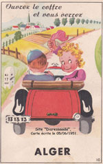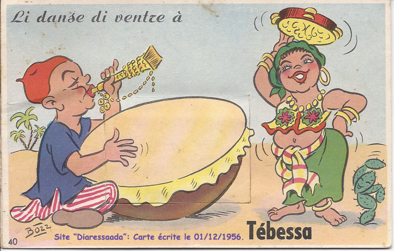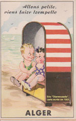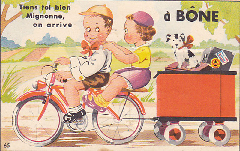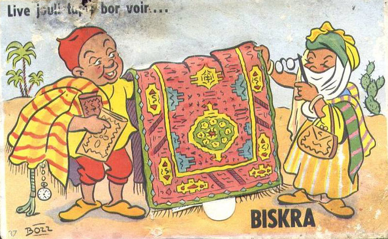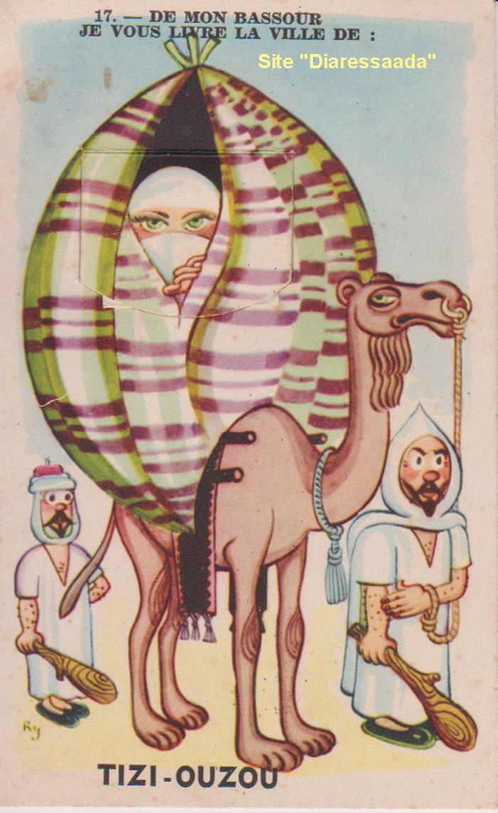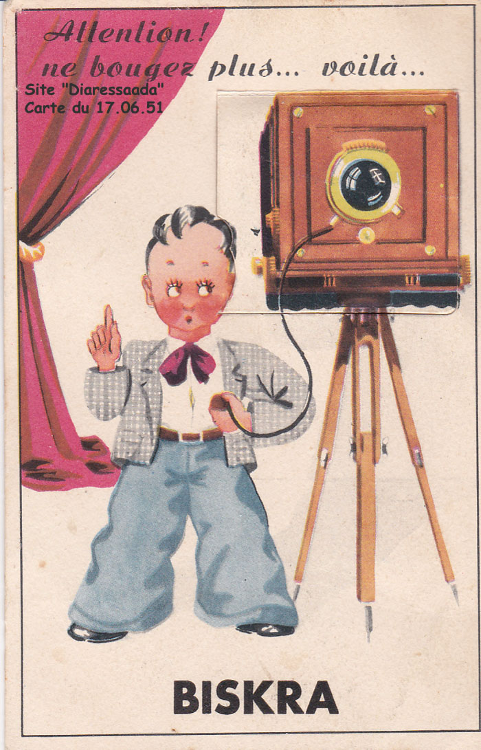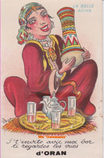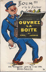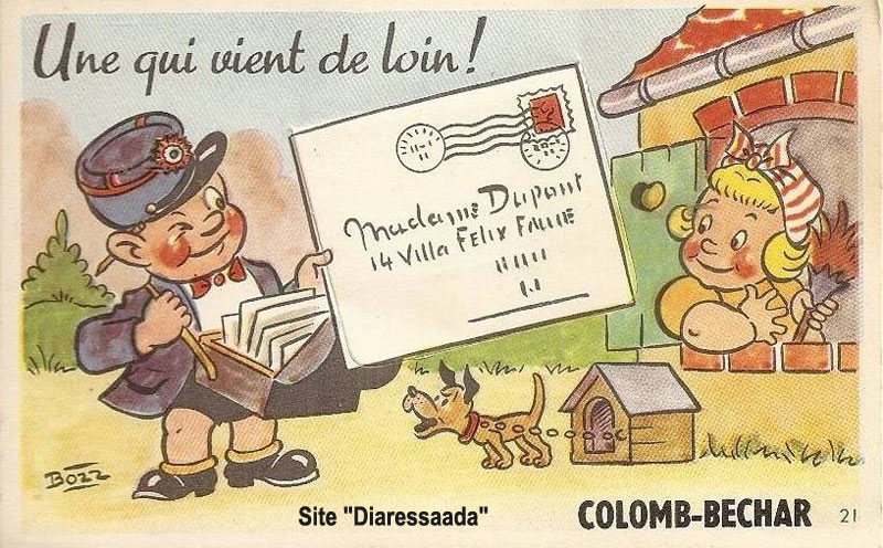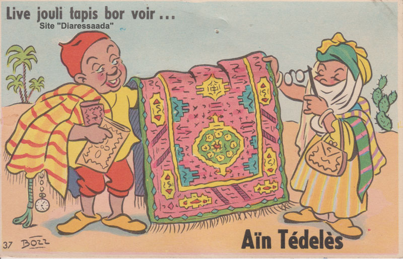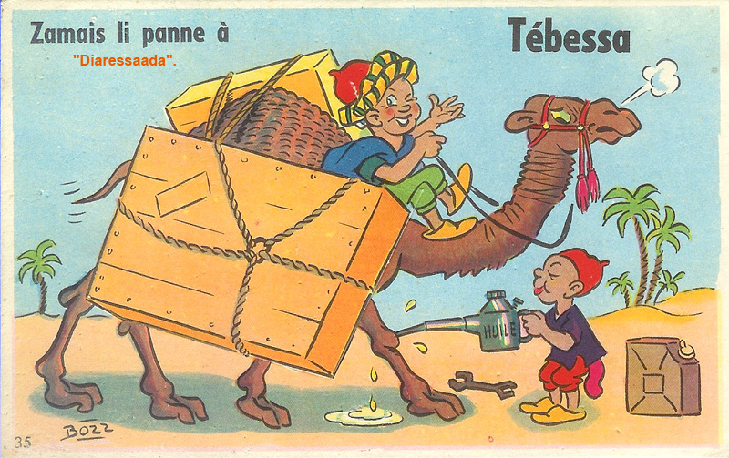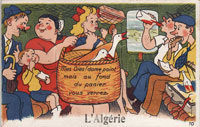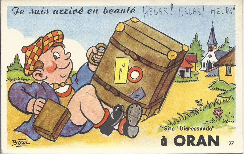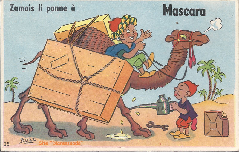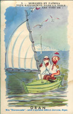 Ajouts: 05.12.2009: 15 cartes: Alger (2), Algérie, Dellys, Djidjelli, Constantine (2), Tlemcen, Sétif, Collo, Colomb-Béchar, Miliana, Philippeville (2), et Sidi-Bel-Abbès. 04.03.2010: 8 cartes: Alger, Aïn-tédélès, Bône, Boufarik, Cherchell, Dellys, Relizane et Saïda. 06.05.10: 2 cartes Alger-Algérie et Oran. 07.06.2010: Ajout de 4 cartes: Alger, Oran, Philippeville et Tébessa. 07.07.2010: Ajout de 5 cartes: Alger, Batna, Oran et Saint-Cloud. 27.07/2010: Ajout de 6 cartes: Chréa, Colomb-Béchar, Médéa, Ménerville, Oran et Sidi-bel-Abbès . 23.10.2010: Ajout de 33 cartes (une dizaine m'a échappé sur Internet!): Alger, Algérie, Biskra, Blida, Bône, Bougie,Collo, Constantine, El-Biar, Guelma, Ménerville, Médéa, Mostaganem , Oran, Philippeville, Sétif et Tizi-Ouzou. 15/12/2010: Bône, Castiglione, Constantine. 11/04/2011: Alger, Algérie, Bône, Bougie, Bouïra, Constantine, Médéa, Philippeville et Tipaza. 28/07/2011: Alger, Azazga, Boufarik, Blida, Cherchell, Colomb-Béchar, Djidjelli, El-Biar, Inkermann, Marnia, Oran, Saint-Cloud. 31.10.2011: 25 nouvelles cartes: Alger (3), Blida (1 refaite), Bône, Collo, Djidjelli , Menerville, Oran(4 dont 1 refaite), Mascara, Perregaux, Sétif, Sidi-bel-Abbès, Tébessa, Tiaret, Tizi-Ouzou. 06.12.2011: 7 nouvelles cartes: Alger, Bougie, Djidjelli, Mascara, Souk-Ahras, Tlemcen. 09.02.2012: 4 nouvelles cartes: Algérie, Djidjelli, Mascara et Sétif. 27.04.2012: Algérie (1), Alger (10), Bône (1), Bougie (2), Bou-Saâda (1), Castiglione (1), Constantine (5), Djidjelli (1), El-Biar (1), Marnia (1), Mascara (1), Ménerville (1), Mostaganem (2), Oran (4), Philippeville (2), Port aux Poules (1). 06.07.2012: Ajout de 27 nouvelles cartes: Algérie (2), Alger (3), Batna (1), Bône (6), Boufarik (1), Constantine (5), El-Biar (3), Guelma (2), Maison-Carrée (1), Mascara (1), Oran (1), Sidi-bel-Abbès (1). 19.08.2012: Ajout de 6 cartes: Algérie (1), Aïn-Sefra (1), Bougie (2), Constantine (1) et Oran (1). 24.02.2013: Ajout de 14 cartes: Azazga (n°27), Biskra (n°37), Collo (n°75), Constantine (n°25), Dellys (n°36), Djidjelli (Mairie), Guelma (n°60), Mostaganem (n°53), Oran (2) (n°21 & n°27), Philippeville (n°1), Relizane (n°44) et Saïda (2) (n°75 & 85). 30.06.2013: Ajout de 11 carte, par ordre alphabétique: Alger (3 dont 2 refaites, n°103 + n°010 & 068), Bou-Saâda (2: n°35 & 38), Constantine (1: n°003), El-Biar (1: n°06), Oran (1: n°008), Philippeville (2: n°093 & n°"1951" refaite), Sétif (n°20), Sidi-bel-Abbès (1 n°39 refaite). 17.09.2013: Ajout de 6 cartes: Algérie (n°100), Azazga (n°11), Inkermann (n°38), Marnia (n°45), Philippeville (n°37), Saïda (n°38). 31.01.2014: Alger (n°15, n°29, "valise","trempette"), Algérie (n°8), Arzew (n°82), Blida (Homme à la valise), Bône ("Dromadaires" et n°27), Bougie (n°4), Castiglione (n°06), Colomb-Béchard (n°38), Constantine ("Vue" et "Dromadaires", refaites, et n°6, n°27 et n°75), Marnia (n°23), Médéa (n°36), Ménerville (n°21), Mostaganem ("Bateau", n°37 et °53), Oran ("Vue", n°14, n°15, "Tente"), Sétif ("Facteur"), Souk-Ahras (n°26), Taher (n°39), Tizi-Ouzou (n°17), Tlemcen (n°35). 23.05.2014: Refonte, ajout d'un tableau de présentation des différents modèles de cartes par éditeur, et ajout de 15 cartes, ci-dessous et dans le tableau général: Algérie (n°31 "Scènes et types"), Alger ("pêche sous-marine"), Batna (n°40), Bône (n°49), Bougie (n°23), Bou-Saâda (n°37), Collo (n°23), Constantine (n°51 et "voyageuse"), Dellys (n°28 et 79), Frenda (n°1), Miliana (n°37), Mostaganem (n°53), Sidi-bel-Abbès (n°41). 28.06.2014: Ajout de 6 cartes, la n°8 CAP dans la présentation des différents modèles, et dans le tableau général par ville: Algérie (n°25), Alger (n°8), Bône (n°38 et n°65), Oran (n°8) et Sétif (n°4). 30/08/2014: Ajout de 2 cartes, la n°91 des éditions Gaby dans la présentation des différents modèles, et par ville, Blida (n°91) et Marnia (n°37). 22/10/2014: Ajout de 13 cartes, la n°72 CAP dans la présentation des différents modèles, ci-dessous, et à Oran, la n°108 Gaby, dans la présentations des différents modèles, ci-dessous, et à Alger, les n° 1, 3 et 9 signées NERI et éditées par CAP, dans la présentation des différents modèles, ci-dessous et à Alger, le "Facteur", dans la présentation des différents modèles sans éditeur, ci-dessous et à Alger, et Alger (n°21 et 49 CAP, Leconte, n°13 Jomone), Arzew (n°17 Jomone), Boufarik (n°13 Jomone), Djidjelli (n°10 Jomone). 23/02/2015: Ajout de 2 cartes ci-dessous dans les différents modèles (1 Delboy, Mostaganem: le garde-champêtre, et 1 Levy & Neurdein, Philippeville, "sur la plage"), et de 17 cartes par ville (immédiatement ci-dessous et par villes): 2 Algérie et "Scènes et types", 1 Alger (n°12 Jomone "Mauresque"), 2 Bouïra et les gorges de Palestro (n° 41 et 43 EPA), 2 Constantine (n°18 Gaby "tacot" et le "facteur"), 1 Gouraya (n°37 EPA), 1 Médéa (vue), 4 Ménerville (n° 22, 36, 37 et 38 CAP), 1 Mostaganem (Garde-champêtre), 1 Philippeville (Levy: "pluie sur la plage"), 1 Taher (n°38 CAP), et 1 Zéralda (n°16 EPA). 03/08/2015: Ajout de 5 cartes ci-dessous dans les différents modèles (1 CAP n°68, 2 Gaby: n°9 "Girouette Coq" et "Marchand de tapis", 1 Neri n°6 "Petit porteur" et 1 n°27 sans auteur "Policier") et de 9 cartes par ville (immédiatement ci-dessous et dans les villes): 2 Algérie (Gaby n°9 "Coq" et n°27 "Policier"), 2 Alger (Néri n°6 "Petit porteur et Gaby "Tapis"), 2 Bône (n°21 et n°68 CAP), 1 Chréa (Narguilé), 1 Saïda (Car), et 1 Sidi-bel-Abbès (Chameau buvant). 03/09/2015: Ajout d'une carte (Néri / Artaud n°5) et à Bou-Saâda. 10/11/2013: Ajout de 7 cartes ci-dessous (CAP n°3 (tente) & n°32 (jumelles)) + MD2 (femme à la TV) + ? (femme à l'appareil photo) + neri (belle Aïcha) + Delboy (écolière) + Gaby n°2 (Hélicoptère)) dans les différents modèles et de 31 car