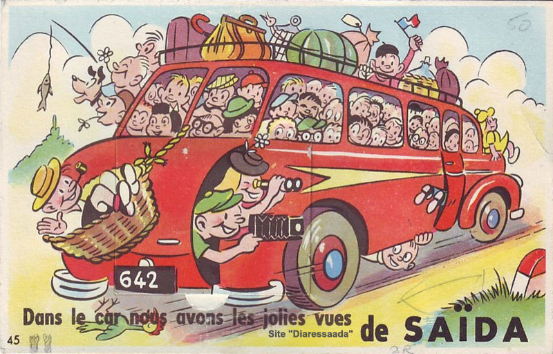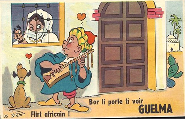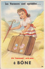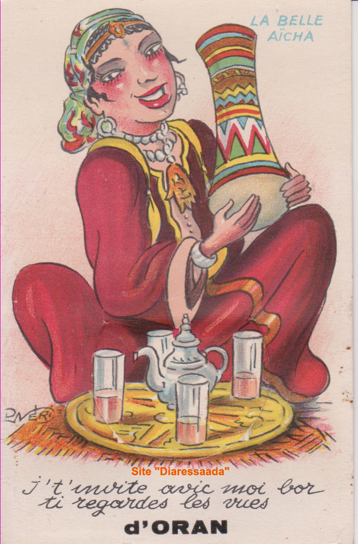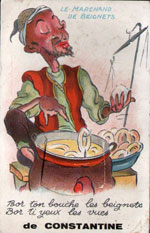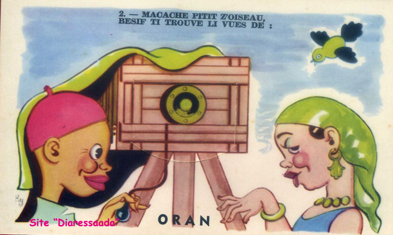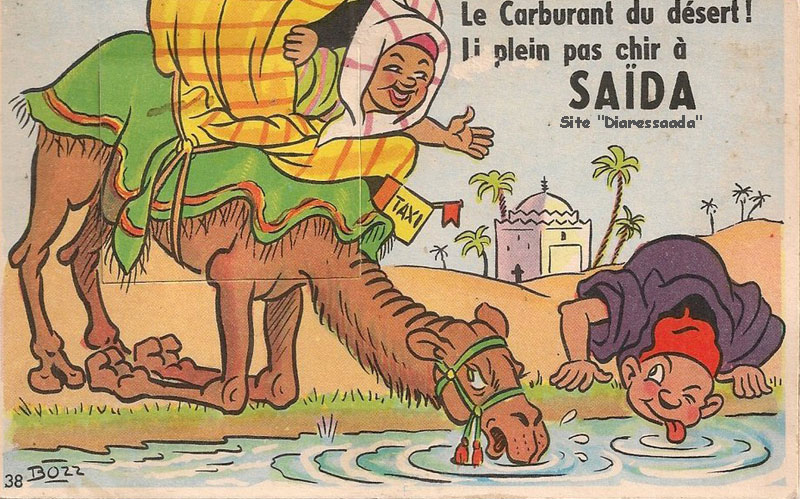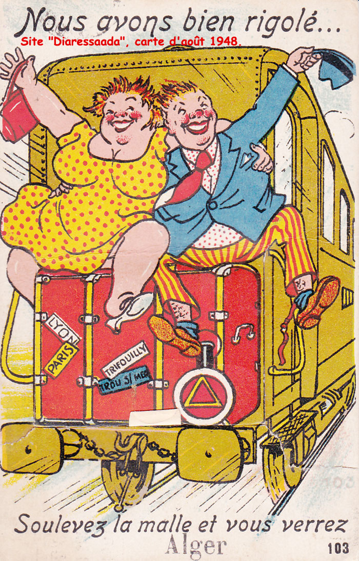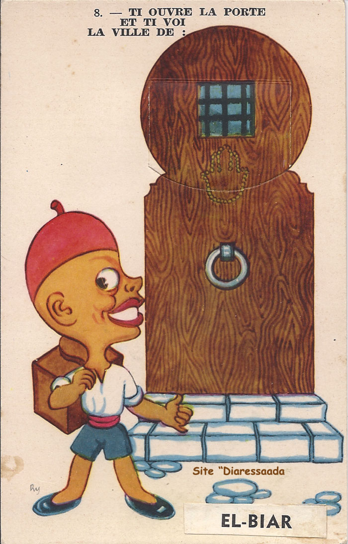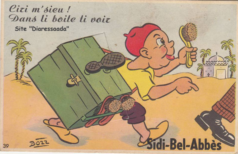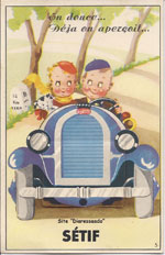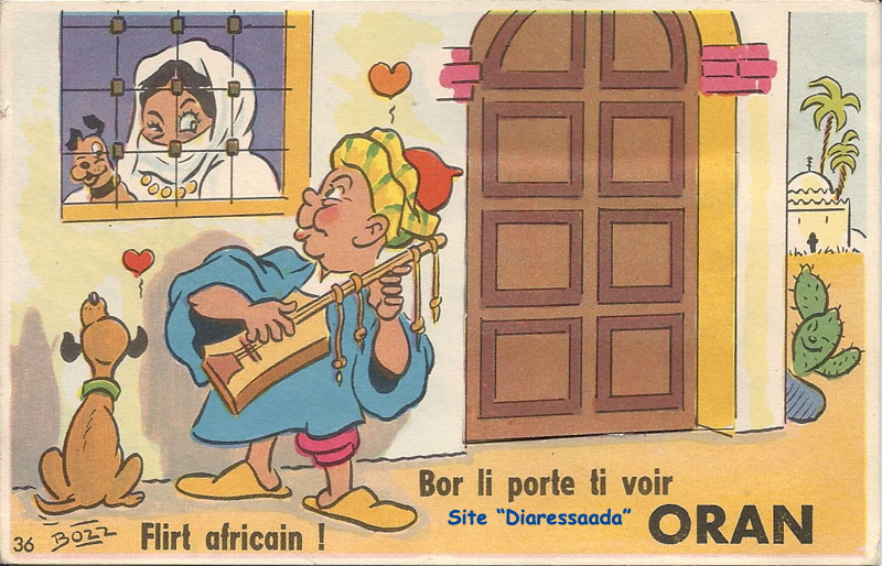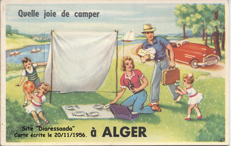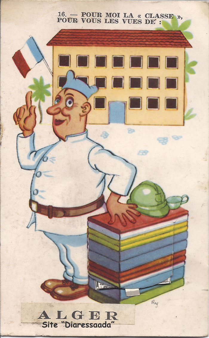 Ajouts: 05.12.2009: 15 cartes: Alger (2), Algérie, Dellys, Djidjelli, Constantine (2), Tlemcen, Sétif, Collo, Colomb-Béchar, Miliana, Philippeville (2), et Sidi-Bel-Abbès. 04.03.2010: 8 cartes: Alger, Aïn-tédélès, Bône, Boufarik, Cherchell, Dellys, Relizane et Saïda. 06.05.10: 2 cartes Alger-Algérie et Oran. 07.06.2010: Ajout de 4 cartes: Alger, Oran, Philippeville et Tébessa. 07.07.2010: Ajout de 5 cartes: Alger, Batna, Oran et Saint-Cloud. 27.07/2010: Ajout de 6 cartes: Chréa, Colomb-Béchar, Médéa, Ménerville, Oran et Sidi-bel-Abbès . 23.10.2010: Ajout de 33 cartes (une dizaine m'a échappé sur Internet!): Alger, Algérie, Biskra, Blida, Bône, Bougie,Collo, Constantine, El-Biar, Guelma, Ménerville, Médéa, Mostaganem , Oran, Philippeville, Sétif et Tizi-Ouzou. 15/12/2010: Bône, Castiglione, Constantine. 11/04/2011: Alger, Algérie, Bône, Bougie, Bouïra, Constantine, Médéa, Philippeville et Tipaza. 28/07/2011: Alger, Azazga, Boufarik, Blida, Cherchell, Colomb-Béchar, Djidjelli, El-Biar, Inkermann, Marnia, Oran, Saint-Cloud. 31.10.2011: 25 nouvelles cartes: Alger (3), Blida (1 refaite), Bône, Collo, Djidjelli , Menerville, Oran(4 dont 1 refaite), Mascara, Perregaux, Sétif, Sidi-bel-Abbès, Tébessa, Tiaret, Tizi-Ouzou. 06.12.2011: 7 nouvelles cartes: Alger, Bougie, Djidjelli, Mascara, Souk-Ahras, Tlemcen. 09.02.2012: 4 nouvelles cartes: Algérie, Djidjelli, Mascara et Sétif. 27.04.2012: Algérie (1), Alger (10), Bône (1), Bougie (2), Bou-Saâda (1), Castiglione (1), Constantine (5), Djidjelli (1), El-Biar (1), Marnia (1), Mascara (1), Ménerville (1), Mostaganem (2), Oran (4), Philippeville (2), Port aux Poules (1). 06.07.2012: Ajout de 27 nouvelles cartes: Algérie (2), Alger (3), Batna (1), Bône (6), Boufarik (1), Constantine (5), El-Biar (3), Guelma (2), Maison-Carrée (1), Mascara (1), Oran (1), Sidi-bel-Abbès (1). 19.08.2012: Ajout de 6 cartes: Algérie (1), Aïn-Sefra (1), Bougie (2), Constantine (1) et Oran (1). 24.02.2013: Ajout de 14 cartes: Azazga (n°27), Biskra (n°37), Collo (n°75), Constantine (n°25), Dellys (n°36), Djidjelli (Mairie), Guelma (n°60), Mostaganem (n°53), Oran (2) (n°21 & n°27), Philippeville (n°1), Relizane (n°44) et Saïda (2) (n°75 & 85). 30.06.2013: Ajout de 11 carte, par ordre alphabétique: Alger (3 dont 2 refaites, n°103 + n°010 & 068), Bou-Saâda (2: n°35 & 38), Constantine (1: n°003), El-Biar (1: n°06), Oran (1: n°008), Philippeville (2: n°093 & n°"1951" refaite), Sétif (n°20), Sidi-bel-Abbès (1 n°39 refaite). 17.09.2013: Ajout de 6 cartes: Algérie (n°100), Azazga (n°11), Inkermann (n°38), Marnia (n°45), Philippeville (n°37), Saïda (n°38). 31.01.2014: Alger (n°15, n°29, "valise","trempette"), Algérie (n°8), Arzew (n°82), Blida (Homme à la valise), Bône ("Dromadaires" et n°27), Bougie (n°4), Castiglione (n°06), Colomb-Béchard (n°38), Constantine ("Vue" et "Dromadaires", refaites, et n°6, n°27 et n°75), Marnia (n°23), Médéa (n°36), Ménerville (n°21), Mostaganem ("Bateau", n°37 et °53), Oran ("Vue", n°14, n°15, "Tente"), Sétif ("Facteur"), Souk-Ahras (n°26), Taher (n°39), Tizi-Ouzou (n°17), Tlemcen (n°35). 23.05.2014: Refonte, ajout d'un tableau de présentation des différents modèles de cartes par éditeur, et ajout de 15 cartes, ci-dessous et dans le tableau général: Algérie (n°31 "Scènes et types"), Alger ("pêche sous-marine"), Batna (n°40), Bône (n°49), Bougie (n°23), Bou-Saâda (n°37), Collo (n°23), Constantine (n°51 et "voyageuse"), Dellys (n°28 et 79), Frenda (n°1), Miliana (n°37), Mostaganem (n°53), Sidi-bel-Abbès (n°41). 28.06.2014: Ajout de 6 cartes, la n°8 CAP dans la présentation des différents modèles, et dans le tableau général par ville: Algérie (n°25), Alger (n°8), Bône (n°38 et n°65), Oran (n°8) et Sétif (n°4). 30/08/2014: Ajout de 2 cartes, la n°91 des éditions Gaby dans la présentation des différents modèles, et par ville, Blida (n°91) et Marnia (n°37). 22/10/2014: Ajout de 13 cartes, la n°72 CAP dans la présentation des différents modèles, ci-dessous, et à Oran, la n°108 Gaby, dans la présentations des différents modèles, ci-dessous, et à Alger, les n° 1, 3 et 9 signées NERI et éditées par CAP, dans la présentation des différents modèles, ci-dessous et à Alger, le "Facteur", dans la présentation des différents modèles sans éditeur, ci-dessous et à Alger, et Alger (n°21 et 49 CAP, Leconte, n°13 Jomone), Arzew (n°17 Jomone), Boufarik (n°13 Jomone), Djidjelli (n°10 Jomone). 23/02/2015: Ajout de 2 cartes ci-dessous dans les différents modèles (1 Delboy, Mostaganem: le garde-champêtre, et 1 Levy & Neurdein, Philippeville, "sur la plage"), et de 17 cartes par ville (immédiatement ci-dessous et par villes): 2 Algérie et "Scènes et types", 1 Alger (n°12 Jomone "Mauresque"), 2 Bouïra et les gorges de Palestro (n° 41 et 43 EPA), 2 Constantine (n°18 Gaby "tacot" et le "facteur"), 1 Gouraya (n°37 EPA), 1 Médéa (vue), 4 Ménerville (n° 22, 36, 37 et 38 CAP), 1 Mostaganem (Garde-champêtre), 1 Philippeville (Levy: "pluie sur la plage"), 1 Taher (n°38 CAP), et 1 Zéralda (n°16 EPA). 03/08/2015: Ajout de 5 cartes ci-dessous dans les différents modèles (1 CAP n°68, 2 Gaby: n°9 "Girouette Coq" et "Marchand de tapis", 1 Neri n°6 "Petit porteur" et 1 n°27 sans auteur "Policier") et de 9 cartes par ville (immédiatement ci-dessous et dans les villes): 2 Algérie (Gaby n°9 "Coq" et n°27 "Policier"), 2 Alger (Néri n°6 "Petit porteur et Gaby "Tapis"), 2 Bône (n°21 et n°68 CAP), 1 Chréa (Narguilé), 1 Saïda (Car), et 1 Sidi-bel-Abbès (Chameau buvant). 03/09/2015: Ajout d'une carte (Néri / Artaud n°5) et à Bou-Saâda. 10/11/2013: Ajout de 7 cartes ci-dessous (CAP n°3 (tente) & n°32 (jumelles)) + MD2 (femme à la TV) + ? (femme à l'appareil photo) + neri (belle Aïcha) + Delboy (écolière) + Gaby n°2 (Hélicoptère)) dans les différents modèles et de 31 car