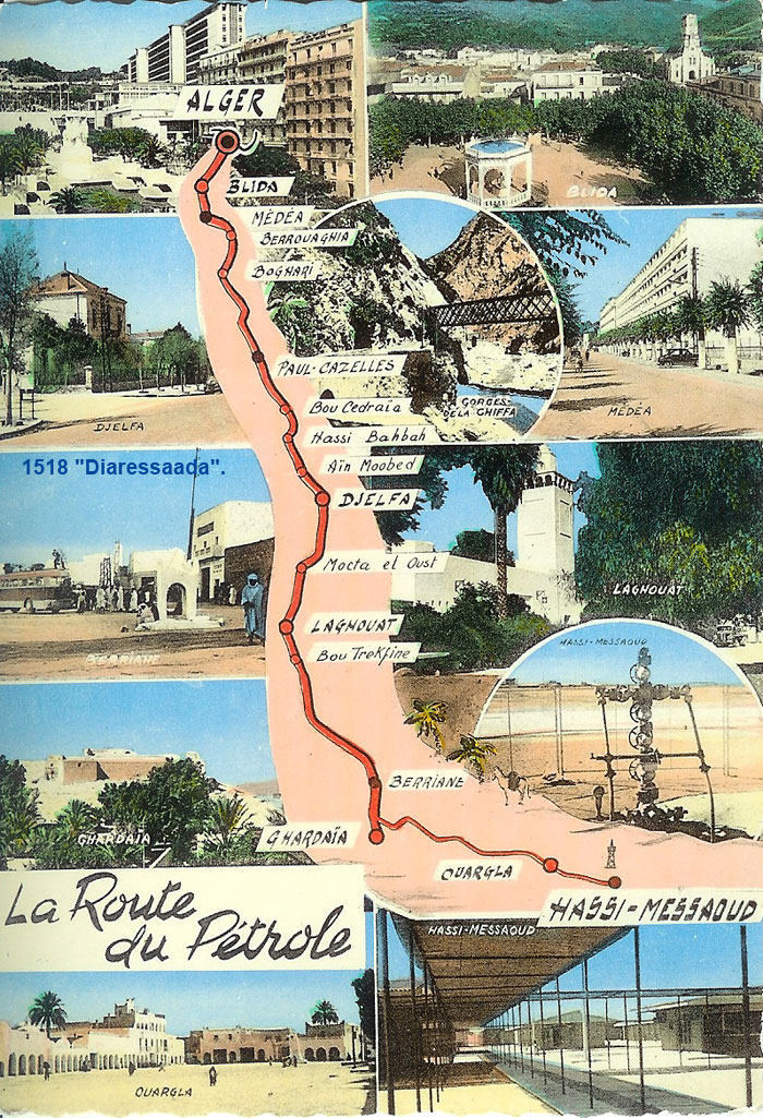 Routes du Sahara: De Oran à Colomb-Béchar, Alger à Ghardaïa et Hassi-Messaoud, Philippeville à Hassi-Messaoud, et Bône à El-Oued.