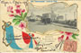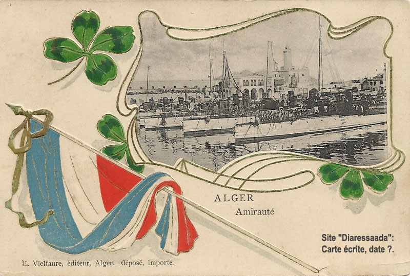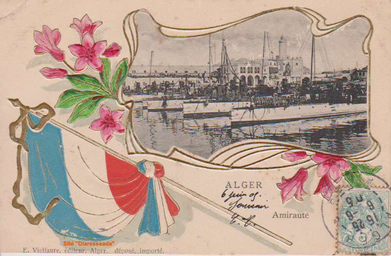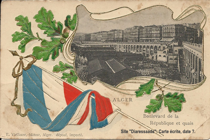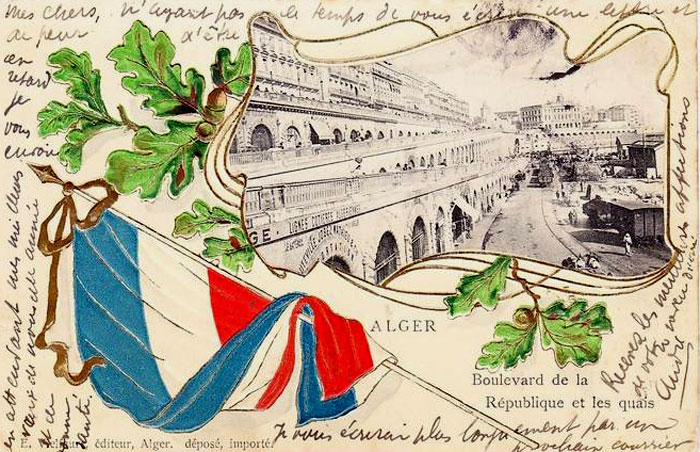 Pour commencer, une série de belles cartes emblématiques de l'Algérie française, sur fond patriotique, celle du "Drapeau", en relief, et avec feuilles ou fleurs encadrant une vue d'Alger. J'ai découvert cette série grâce au très beau livre de Teddy ALZIEU aux Éditions Alan Sutton, "Alger autrefois", dont j'ai scanné les deux pages reproduites de part et d'autre du texte. J'ai pu retrouver un certain nombre de ces cartes. Ma quête est loin d'être terminée. Les cartes présentées, quand elles possèdent un cachet, furent expédiées entre 1903 et 1905. Devant le nombre croissant de ces cartes, j'ai été amené à effectuer le 18/12/2009 une refonte de la présentation de ces cartes. Apparemment il existe 4 types de modèle par sujet: Feuilles de chêne, fleurs blanches, fleurs rouges et feuilles de trèfle, et 9 sujets différents dans la série. J'ai donc laissé de la place, en espérant des trouvailles et acquisitions futures. 27.03.2014: + 1 carte (n°28) "Boulevard de la République et les quais" . 28/11/2015: + 1 carte "Amirauté".