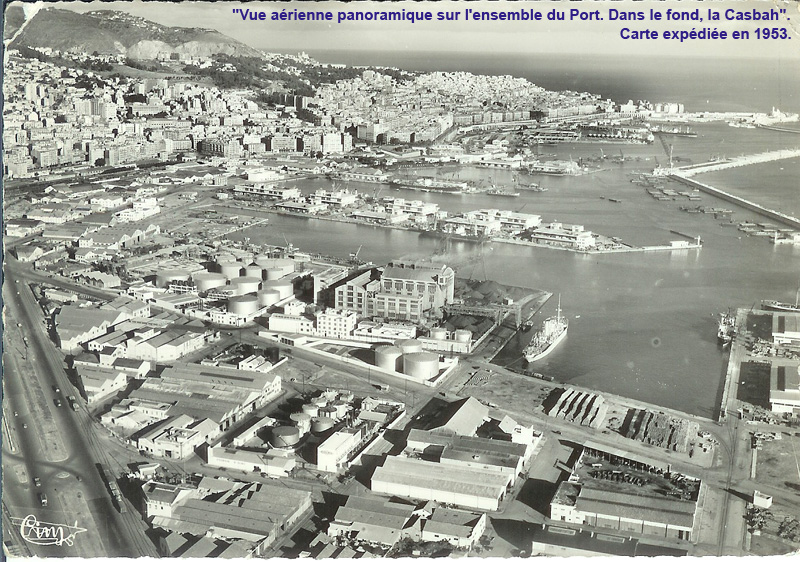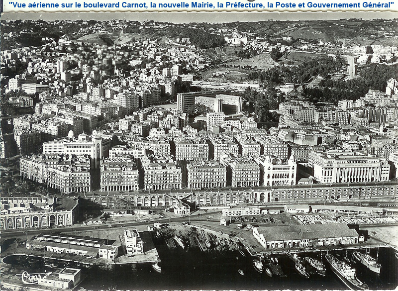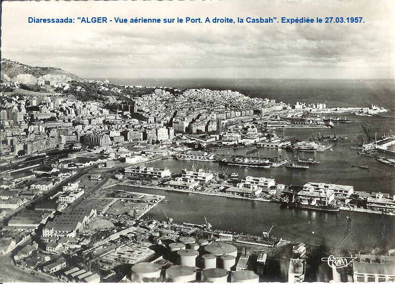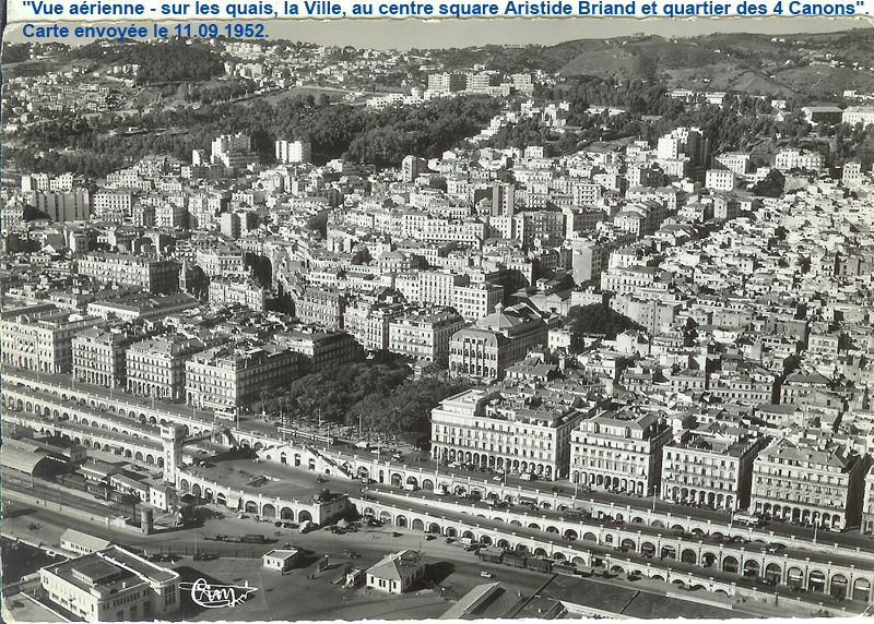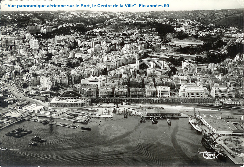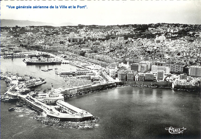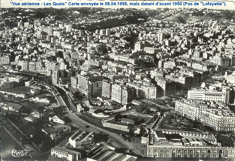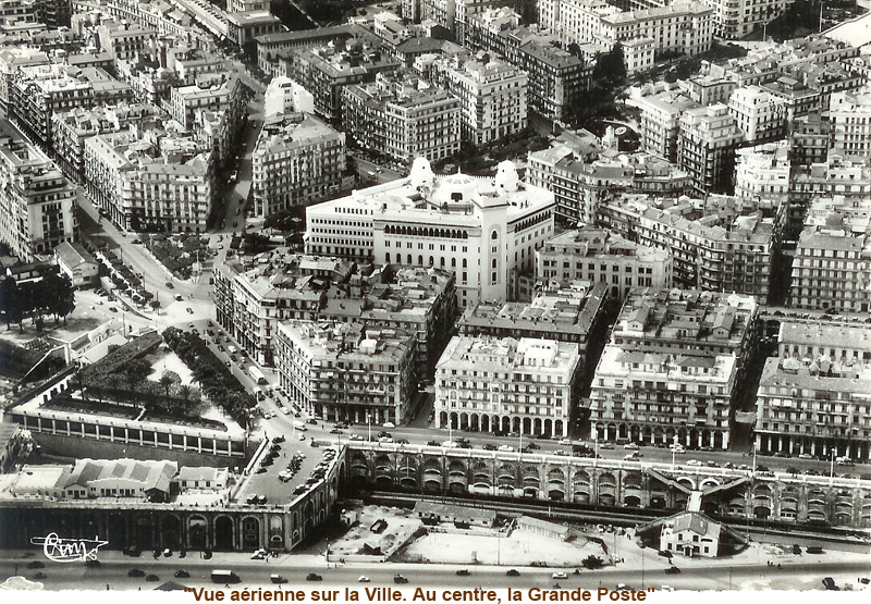 Cartes postales de vues aériennes d'Alger, en grande partie prises par avion, quelques unes prises depuis les immeubles du Télemly ou depuis le boulevard Bru. Elles furent éditées principalement par "La Cigogne", "Baconnier Frères", "L. Dessault" ou "J. Geiser" d'Alger, et "Jansol" (parfois relayées par "Gallice & Cie" d'Alger) de Chambery ou "CAP" de Paris. "Jomone" d'Alger, qui édita une grande partie des cartes postales de la ville durant les années cinquante, présenta assez peu de vues aériennes. Les cartes "CIM" et "Greff" sont présentées dans le paragraphe suivant. J'ai noté sur chaque carte la légende exacte, lorsque celle ci est inscrite au recto, ainsi que la date d'écriture ou d'envoi. Éventuellement quelques commentaires. J'ai aussi supprimé la colorisation artificielle de certaines cartes afin de les rendre plus lisibles. On retrouvera en dernier, les vues aériennes de Diar-es-Saâda et de Diar-el-Mahçoul, avec un scan du verso de ces deux cartes.