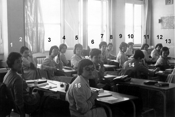 ![]() 1- Hélène FACQUEUR 2- Évelyne DUCY 3- Jacqueline BARBE 4- Geneviève MOLL 5- Liliane ELBAZ 6- Nicole DIEZ 7- Jacqueline LEBAZ 8- Maryse RAMOS 9- Dalila NOUAR 10- Suzanne MOLL 11- Françoise BABY 12- Odile MARY 13- Anastasie VASCOVALI 14- Gladys BENDAVID |