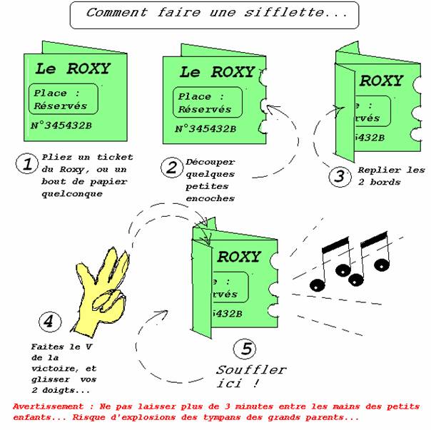 Sur les bancs, tout près de l’écran, les enfants. Avec leurs billets de papier, ils confectionnaient en les pliant, des « sifflettes »*.