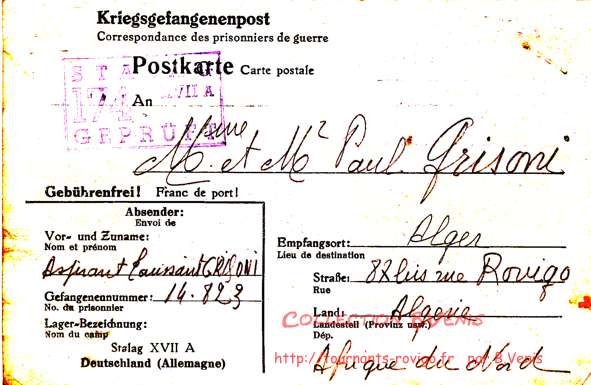 Pour le 87 bis rue Rovigo, m. et mme Paul Grisoni. Un de leurs enfants ( Toussaint ?) est prisonnier de guerre.