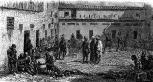 siècle "C'est une voûte à trente pieds sous la terre, divisée en trois parties. La plus grande partie peut être environ de vingt-huit pieds de longueur et large de vingt-quatre pieds; les deux autres parties sont moindres. Et là étaient détenus ordinairement cent soixante-dix esclaves chrétiens. Cette prison n'a d'autre lumière que trois treilles qui sont en haut, au milieu de la rue et chacune de ces treilles est un crochet avec une corde, et quand de jour passent quelques chrétiens, de charité ils portent aux pauvres esclaves de l'eau ou bien, s'ils ont de l'argent, ils leur achètent quelque chose. Et ladite corde avec le crochet sert pour avaler ce que l'on a envie de donner aux pauvres..." Relation de la captivité du sieur Emmanuel d’Aranda, esclave à Alger. La Haye, 1657 |