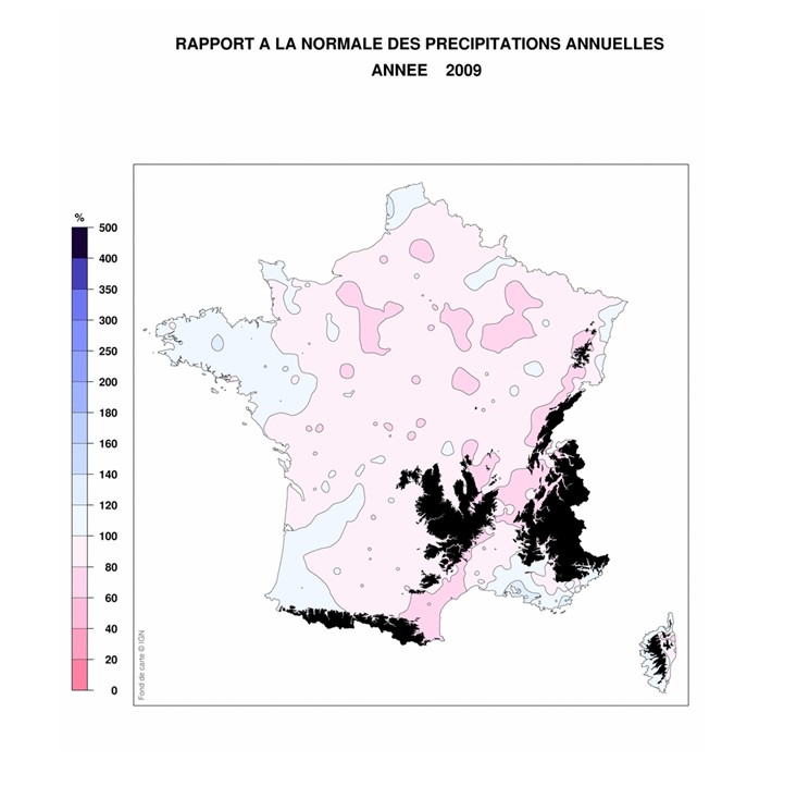 En 2009, les précipitations ont été globalement déficitaires sur le pays, avec des cumuls annuels ne représentant parfois que 70 à 80 % des valeurs normales.