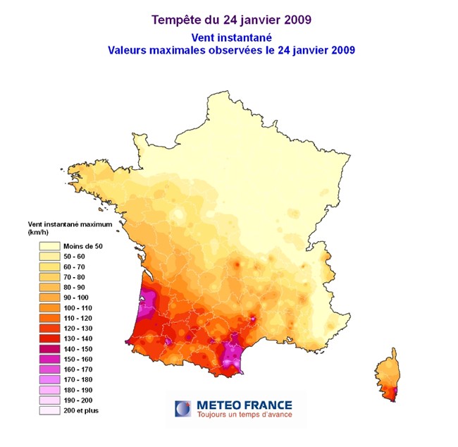 le 24 de la tempête Klaus, d'intensité comparable à celles de décembre 1999. Les plus fortes rafales ont souvent dépassé 120 à 130 km/h sur le Sud-Ouest, atteignant