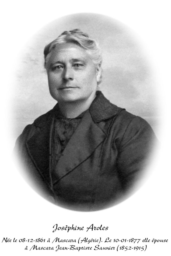 Joséphine Aroles née dans la ville de Mascara le 08/12/1801, épouse le 10/01/1877 à Mascara ( Algérie ), Jean-Baptiste Saunier né le 13/02/1852 à Jouvençon ( Saône et Loire ).
