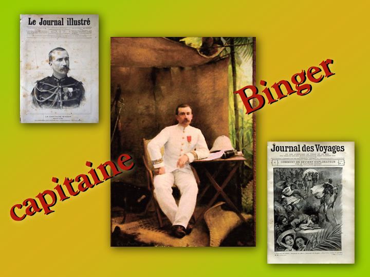Biographie de Louis Gustave BINGER (1856-1936) Explorateur de l’ Afrique Occidentale, premier Gouverneur de la Côte d’Ivoire, Directeur des Affaires d’Afrique au Ministère des Colonies. Ayant été au cours de ses deux grandes expéditions, tour à tour, botaniste, zoologue, géographe, sociologue, géologue, ethnologue et s’est entouré de photographes. Il a participé à la construction de l’Afrique moderne.
