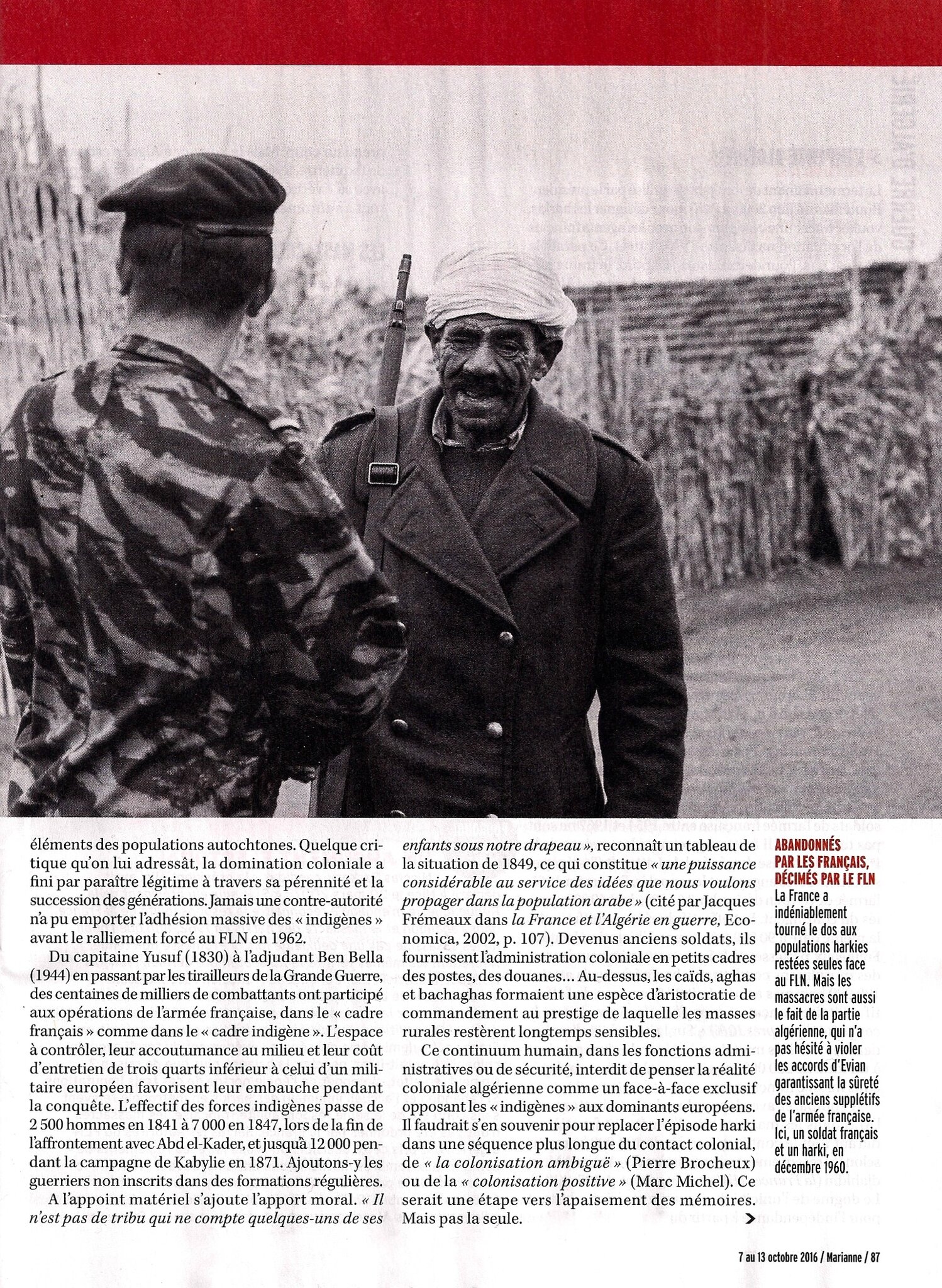 Ce continuum humain, dans les fonctions administrative ou de sécurité, interdit de penser la réalité coloniale algérienne comme un face-à-face exclusif opposant les «indigènes» aux dominants européens. Il faudrait s’en souvenir pour replacer l’épisode harki dans une séquence plus longue du contact colonial, de «la colonisation ambiguë» (Pierre Brocheux) ou de la «colonisation positive» (Marc Michel). Ce serait une étape vers l’apaisement des mémoires. Mais pas la seule.