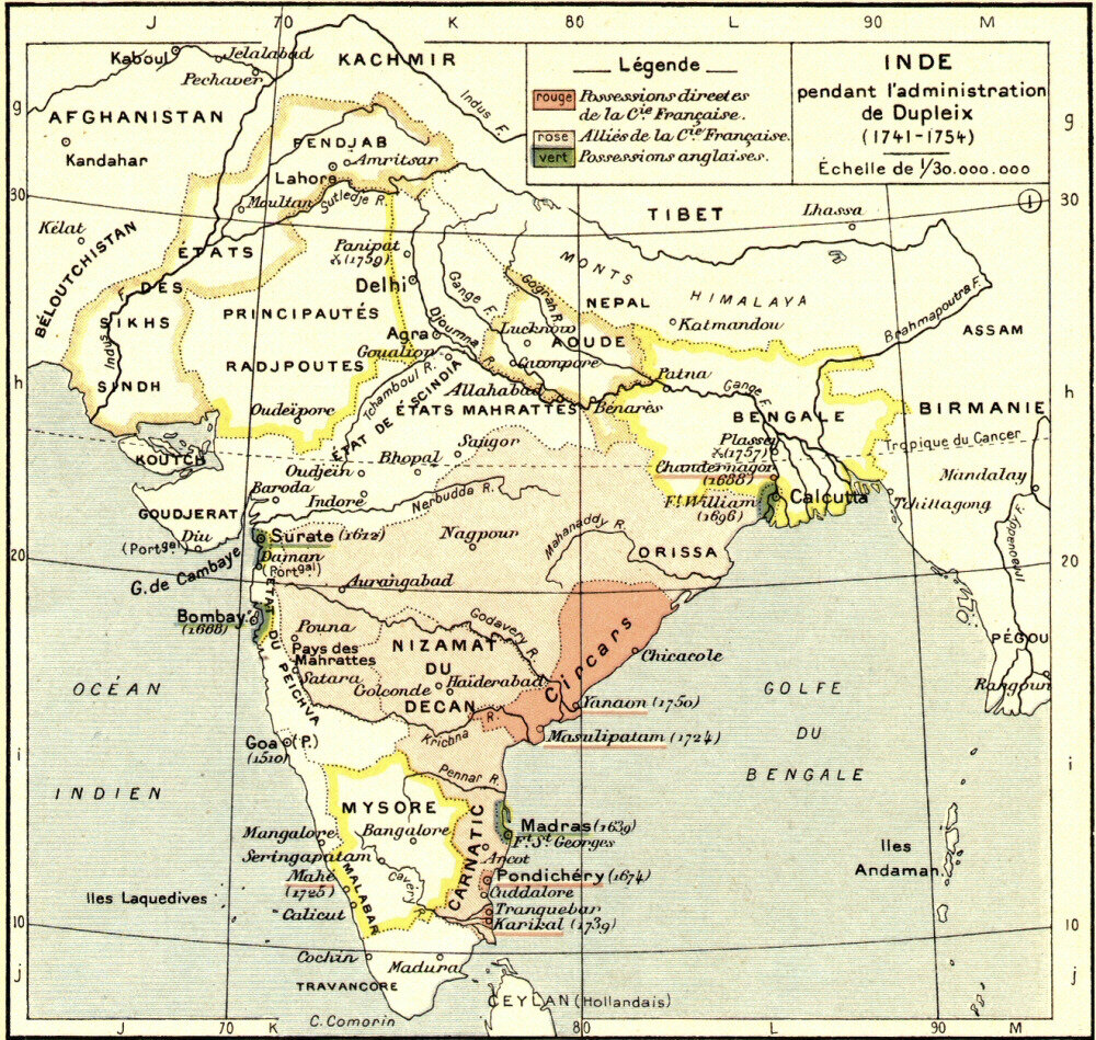 Si les Isles commencent à souffrir d’une population nombreuse, serrée sur des espaces utiles que le relief restreint, le Canada connaît les maux inverses. Il étale sans mesure, sur des étendues quasi illimitées et inorganisées, des éléments humains insignifiants, partant très vulnérables. Le mal est encore plus grave encore en Louisiane. Mais qui serait en mesure d’établir une meilleure répartition ? Aux Indes, il y a nécessité d’une option ; la Compagnie vient d’acquérir le titre et les prérogatives d’un souverain. Peut-elle se contenter désormais de seules préoccupations mercantiles ? Le temps n’est-il pas venu de passer des comptoirs au domaine territorial ?