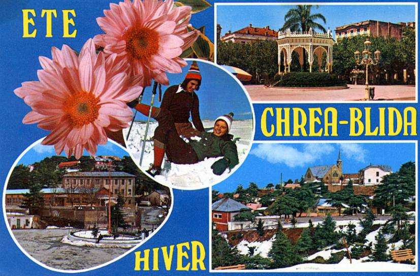 Beni Saf Chréa Blida  : rue Denfert Rochereau Blida : Gorges de la Chiffa Blida :  Gorges de la Chiffa Blida : Marché arabe Blida :  Rue Bécourt Bône : Place de la Liberté Bône : Collège de filles Bône : Mosquée Constantine Constantine Constantine Douéra : Avenue de l'Hôpital Douéra : Vue générale Douéra : Eglise Douéra  Grande Rue Douéra : Fontaine et lavoir Douéra : Le pénitencier La Calle : Halle aux poissons Eglise de Mascara Michelet Miliana : Collège de garçons Miliana : Collège moderne Miliana : Oued Boutektoub Miliana : La piscine Miliana Miliana : La Pointe des Blagueurs Montenotte Entrée du port de Philippeville Philippeville : Stora Philippeville : Square et église St Philippe Relizane Relizane Ténès : La gare Ténès : Vue générale Ténès : La Marine Ténès : Le pont romain Le vieux Ténès Ténès : Avenue de la plage Ténès : Vue de la plage Ténès : La douane Ténès Ténès : Oued Allala Ténès : Plage Ténès : Le port Tipasa Tipasa : Parc Trémeaux Tipasa : Parc Trémeaux Tipasa : Plage TiziOuzou en 1962 Tlemcen : Minaret Agadir Tlemcen : La mosquée