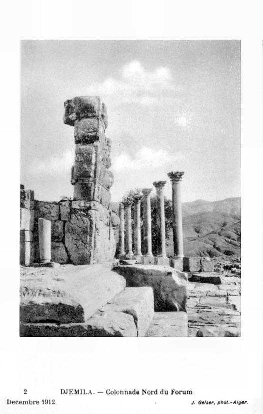 Cherchell : Apollon Cherchell : théâtre Djemila : vue générale Djemila : forum Djemila : forum Djemila : maison Djemila : musée Khemissa : porte de Tipaza Le Kroubs : mausolée Le Kroubs : mausolée Madaure : théâtre Announa : ruines Timgad : forum Timgad : mosaïques Timgad : petit panthéon Tipasa : basilique civile Tipasa : basilique judiciaire Tipasa : sarcophage du Bon Pasteur Tipasa : sarcophage des Epoux Tipasa : tombeau de la Chrétienne Tipasa : tombeau de la Chrétienne Tipasa : tombeau de la reine de la Mauritanie Tipasa : fontaine romaine Tipasa : sarcophage romain Tombeau de Lollius près de Constantine