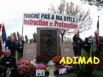 Une banderole affichant " Touche pas à stèle ! Destruction = profanation " a été brandie au-dessus du monument à l’occasion de ce rassemblement qui " devrait, hélas, être le dernier ", a fustigé Jean-François Collin, président de l’Adimad. Celui-ci a indiqué être " déterminé à l’emploi de toutes les voies de recours ". Un référé ayant été hier introduit devant le tribunal de grande instance d’Aix, il a demandé au maire qu’il a qualifié "d’hostile" de ne rien faire d’ici là. |
