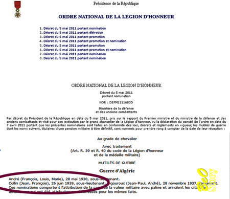 Si cet ancien conseiller municipal FN de la ville de Hyères, dans le Var, a été décoré, c'est donc pour son engagement militaire: "Je remplissais les conditions. J'ai été appelé à l'armée le 1ernovembre 1959. Et j'ai été blessé au combat en Algérie, dans l'Ouarsenis, en 1960, contre les fellagas, par un élément rebelle du Front de libération nationale, j'ai tué mon ennemi qui m'a grièvement blessé, mon biceps droit a été arraché et je suis devenu invalide de guerre . Puis il y a eu le putsch des généraux, j'étais content. Et après avoir été soigné, je suis parti à Paris. J'ai alors pris contact avec l'Organisation de l'armée secrète et j'ai intégré l'OAS métropolitainavec le lieutenantGodot. J'ai été arrêté le 5 février 1962 puis condamné à cinq années de prison que j'ai effectuées à la Santé, à Fresnes, et à l'île de Ré. Puis, le 14juillet 1968, De Gaulle a amnistié l'ensemble de l'OAS, mais la véritable amnistie avec réintégration des grades et des retraites, a eu lieu sous Mitterrand".