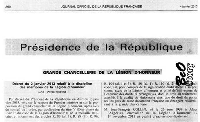 Par décret du Président de la République en date du 2 janvier 2013, pris sur le rapport du Premier ministre et sur la proposition du grand chancelier de la Légion d'honneur, après avis du conseil de l'ordre, par application du titre V (Discipline) du livre V du code de la Légion d'honneur et de la médaille militaire, et notamment des articles R. 83 (al. 1). R. 89 (3°), R. 96, R. 104 (al. 1 et 3). R. 106 (al. 1), R. 110 (al. 2) « R. 168 dudit code, est. pour compter de la signification dudit décret à sa personne, exclu de la Légion d'honneur et privé définitivement de l'exercice des droits et prérogatives, dont le droit au traitement attachés à la qualité de légionnaire ainsi que du droit de porter les insignes de toute décoration française ou étrangère ressortissant à la grande chancellerie :