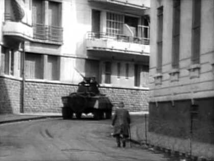 A 16 h. 50. A l'extrémité de l'avenue de la Marne, un escadron d'auto mitrailleuses de la gendarmerie mobile progresse lentement vers le square Guilllemln et le centre de Bab-el-Oued, toutes les mitrailleuses lourdes de l'escadron tirent sur les façades, à raison d'une rafale toutes les 5 secondes. Des nuages de fumée et poussière obscurcissent la rue.