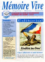 Mémoire Vive est édité par le Centre de documentation historique sur l’Algérie. Association loi 1901. Reconnue d’Utilité publique. Siège social : 29, avenue de Tübingen - 13090 Aix-en-Provence. Adhésion annuelle pour soutenir l’association et s’abonner à la revue est de 20 Euros . Chèque à l’ordre du CDHA, à adresser au CDHA. 29 avenue de Tübingen. 13090 Aix-en-Provence. e-mail : cdhalgerie@9online.fr