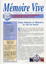 Mémoire Vive est édité par le Centre de documentation historique sur l’Algérie. Association loi 1901. Reconnue d’Utilité publique. Siège social : 29, avenue de Tübingen - 13090 Aix-en-Provence. Adhésion annuelle pour soutenir l’association et s’abonner à la revue est de 20 Euros . Chèque à l’ordre du CDHA, à adresser au CDHA. 29 avenue de Tübingen. 13090 Aix-en-Provence. e-mail : cdhalgerie@9online.fr