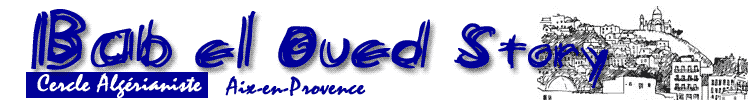 Algérianiste Aix-en-Provence siége local : J.M. CREUTZER 14 chemin du Belvédere 13100 Aix-en-Provence. PRESIDENTE - 16, rue des Matins Clairs - 13770 Venelles - Président : Mme Evelyne JOYAUX - Tél : 04 42 54 03 58. au Cercle Algérianiste. trésoriers du Cercle ouverture nécessite un mot de passe , nous écrire. pour la lecture du bulletin d'adhésion et la liste des trésoriers du Cercle Algérianiste. |